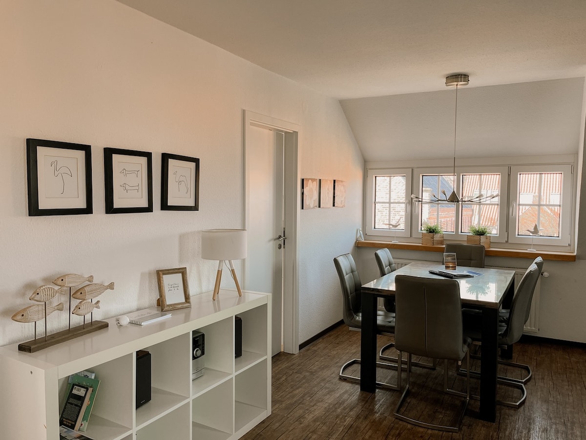 Arriba i sent-te bé. L'aire fresc del mar del Nord, que està a pocs quilòmetres, et rebrà amb brisa. El nou pis de 80 metres quadrats es troba a la PLANTA superior de la nostra casa i està completament a la teva disposició. És acollidor, decorat amb molt bon gust. Al nostre jardí, que pots utilitzar, també hi ha una graella i un gran bol de foc. Les bicicletes es poden aparcar de forma segura.
