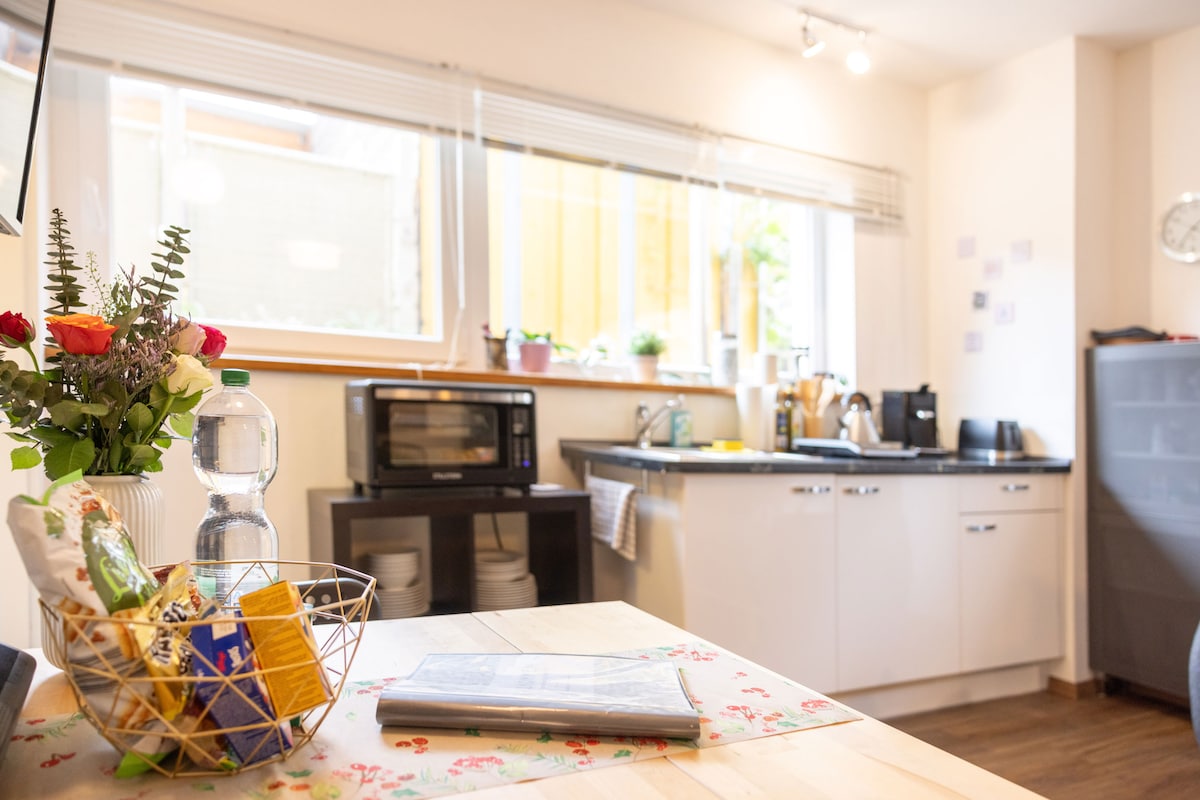 Pis lluminós i modern d'1 dormitori amb un llit doble acollidor i una dutxa amb efecte de pluja: ideal per a una escapada relaxant. Després d'un dia llarg, pots venir aquí, relaxar-te i posar-te còmode. La petita cuina americana està ben equipada; hi ha cafè i te disponibles. Ubicació tranquil·la amb entrada privada i wifi. Bones connexions amb Erlangen, Bamberg i Nuremberg.