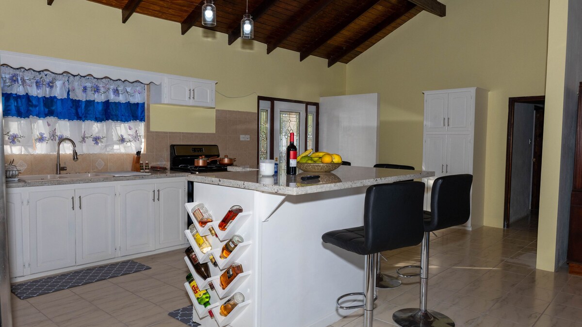 NYUMBANI IS A STYLISH 3 BEDROOM HOME OVERLOOKING TRÈE TOPS AND MOUNTAIN VIEWS, IT IS LOCATED IN A FRIENDLY QUIET NEIGHBOURHOOD, AND WITHIN WALKING DISTANCE TO GRAND ANSE BEACH AS WELL AS RESTAURANT SHOPS BARS AND MALLS, YOU WILL GET THE COOL CARIBBEAN BREEZE THROUGHOUT AND A PATIO WHICH CAN ENTERTAIN FAMILY AND FREINDS OR JUST LOUNGE AND TAKE IN THE SCENERY, ALL ROOMS ARE EN SUITE AND AIR CON TV ENTERTAINMENT FOR THE WHOLE FAMILY KIDS VIDEO GAMES AND GROUNDS ARE CONTAINED. 15MINS FROM AIRPORT.