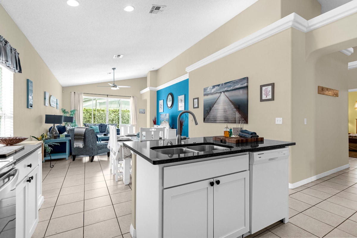 Wow! Gorgeous 2br/2ba courtyard villa w/5-star reviews. Walk to Creekside Landing pool & town square in THE most sought after location in the community. Private yard. Granite counters, vaulted ceilings, big birdcage, French doors & vinyl plank floor. No carpet. Nice recliners, patio chairs, and sofa. King in master br. Queen in guest br. Cable. WIFI. Rent a golf cart (optional). No pets here. I manage a pet friendly 3br across street (sleeps 6). Rest of 2026=4nt min.