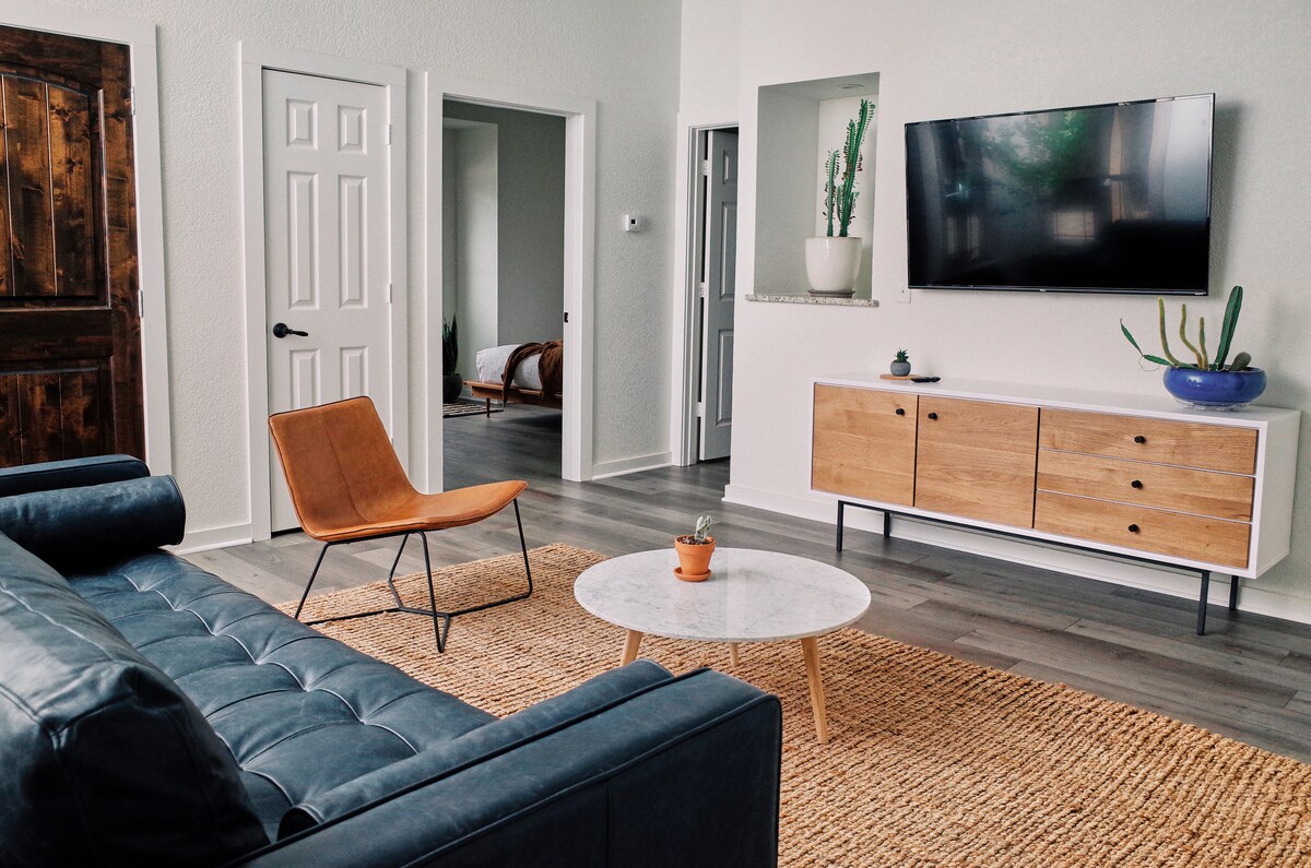 Gaudeix d'una estada Boho Modern: on les textures naturals, el confort modern i l'encant relaxat es combinen a la perfecció. Aquest allotjament, situat a pocs minuts de Creekside, Gruene i el riu Guadalupe, està dissenyat amb molta cura i combina l'estil boho, els tons verds exuberants i les textures modernes per crear un espai elegant i relaxant. Tant si vols fer piragüisme, explorar el centre de la ciutat o relaxar-te després d'un dia a Schlitterbahn, et sentiràs com a casa.