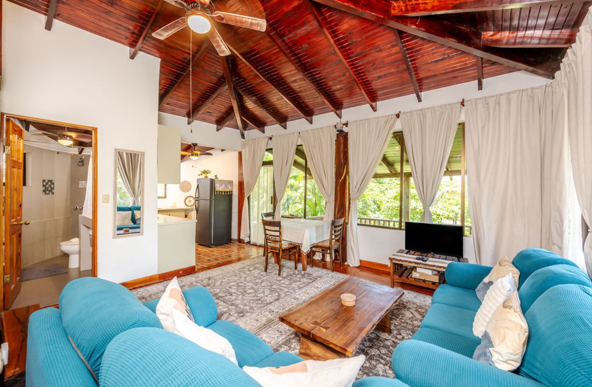 Aquest nou allotjament d'hostes de 2 dormitoris es troba a la part superior del turó Escondido, a la comunitat tancada de Rancho Villa Real. La sala d'estar i el porxo cobert passen per la part superior dels arbres amb vistes impressionants al mar i a la selva. Sovint es veuen micos, ocells i altres animals salvatges habitant els arbres tropicals dels voltants. La casa d'hostes té una entrada molt privada que li dona una sensació separada de la resta de la propietat. Els hostes gaudiran d'accés a la piscina comunitària Rancho Villa Real.