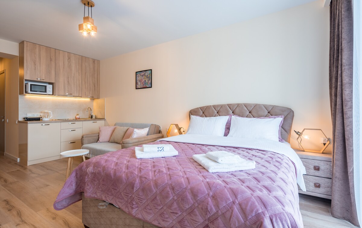 Et donem la benvinguda a aquest apartament estudi lluminós i acollidor, perfectament situat a New Gudauri. Deixa la ubicació, aparcament privat gratuït i al mateix temps molt a prop de tot ( supermercat, farmàcia, cafeteries, bars i els millors camps d'esquí). El pis ofereix una barreja harmònica de comoditat moderna i un ambient càlid. Amb un llit còmode, un sofà còmode, una cuina ben equipada i un bany modern, té tot el que necessites per relaxar-te i recarregar forces.
