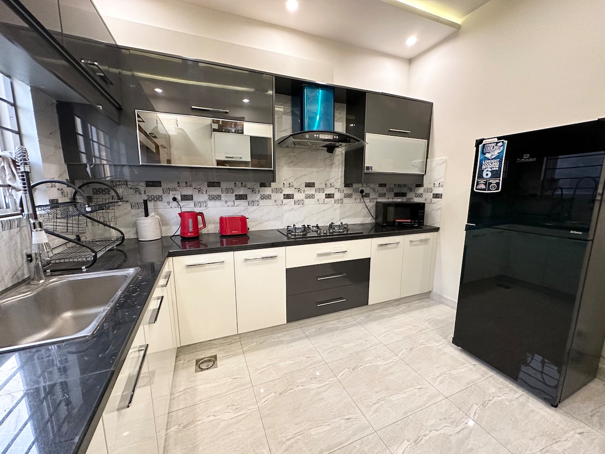 Luxury 2BHK a The Atrium Plaza | Vida moderna amb vistes panoràmiques a la muntanya Gaudeix del luxe en aquest apartament de disseny de 1978 peus quadrats amb 2 habitacions, 2 llits king size, un ampli balcó amb unes vistes impressionants, un televisor intel·ligent de 55 polzades amb Netflix, wifi ultraràpid, cuina completa, aire condicionat inverter i aigua calenta les 24 hores del dia. Amb una ubicació ideal a The Atrium Plaza, a pocs passos de Giga Mall i Zeta Mall i a 2 minuts de DHA 2 Central Park. Perfecte per a famílies o viatgers de negocis. Cal el CNIC. No es pot fumar ni fer festes. Reserva ara!