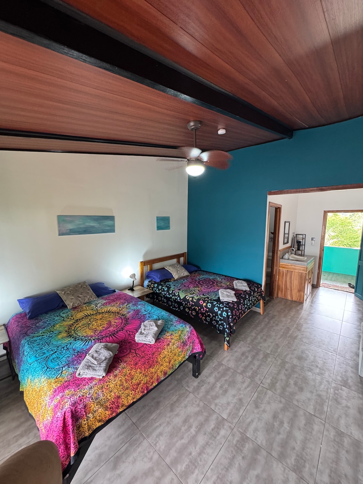 Aquesta àmplia habitació COMPARTIDA COMPARTIDA té capacitat per a fins a sis persones. (tres lliteres) La cabana es troba al costat del nostre allotjament principal, cosa que permet que aquest dormitori sigui privat. Gaudeix d'un balcó privat. Un bany adjunt amb dutxa, vàter i pica separats afegeix comoditat a aquest dormitori. Ara oferim un esmorzar orgànic local cada matí procedent de granges locals de Costa Rica. L'esmorzar està inclòs en l'estada de cada nit.