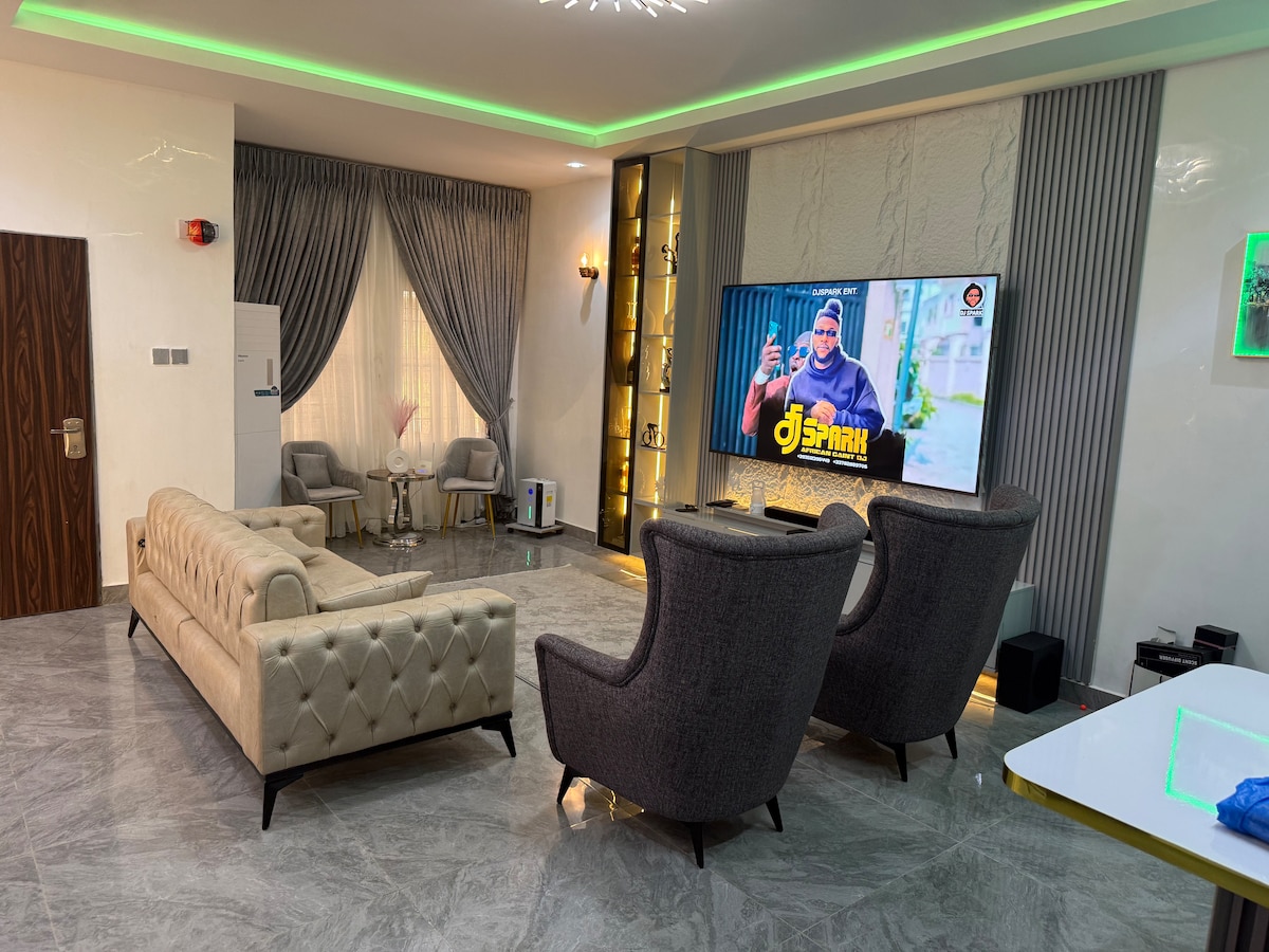 Enjoy a stylish experience at this centrally-located place. Home away from home, with state of the art decor and amenities to make your stay a memorable one. Facilities include: -PlayStation 5 - WiFi - proximity to major places . 2 minutes drive to maitama and 5 minutes drive to wuse 2. - 24hrs electricity with inverter and generator - 2 balconies -2 sitting rooms - Smart TVs in all rooms and parlors.