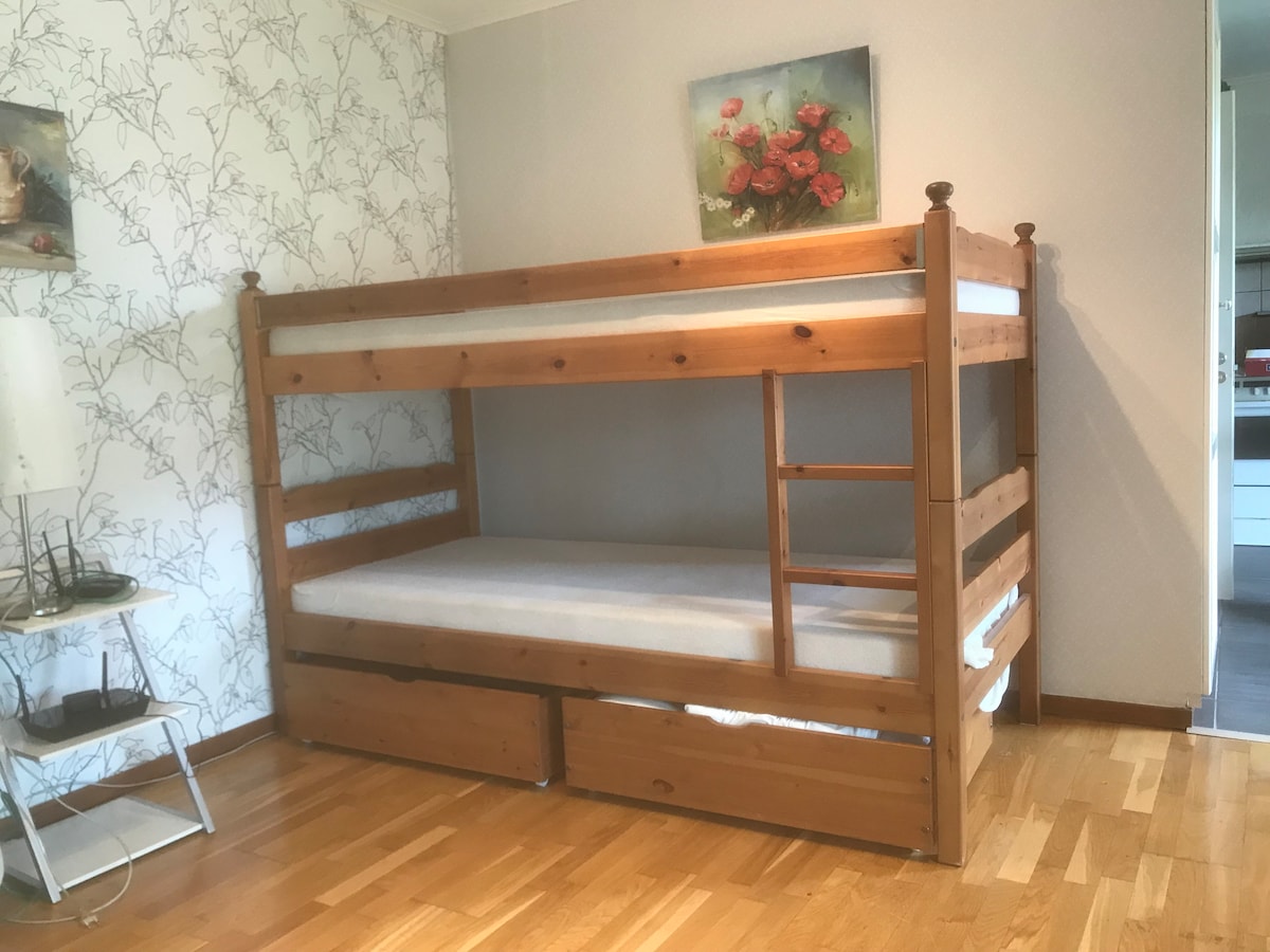 One bedroom downstairs w double bed and new added attic bedroom with one double bed and one bed that also functions as a sofa. Outdoor space with unobstructed sea view and outdoor furniture. From the apartment you can view the sea and walk about 100 meters down to the ocean. 5 minutes away walking by the ocean you get the beautiful sandy beach of Ranarpsstrand, which also hosts a tennis field and a pool.
