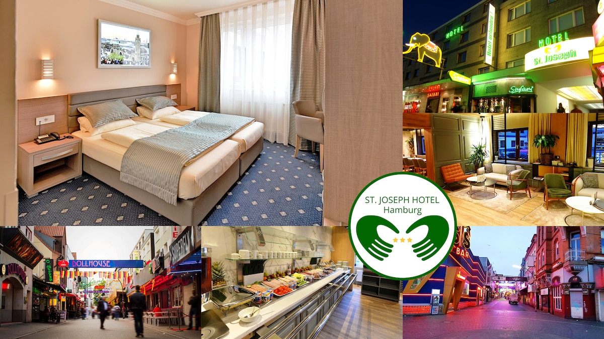Habitació davant del pati del St.Joseph Hotel Hamburg, Große Freiheit 22, 22767 Hamburg. S-Bahn-Station Hamburg Reeperbahn. L'hotel es troba a 3 minuts a peu de les botigues i restaurants de Reeperbahn i a 1 km del St Pauli Elbtunnel. Les acollidores habitacions disposen de bany privat amb dutxa, així com escriptoris, televisors i wifi gratuït. L'esmorzar és gratuït. Un saló informal del vestíbul amb un bar serveix begudes durant tot el dia.