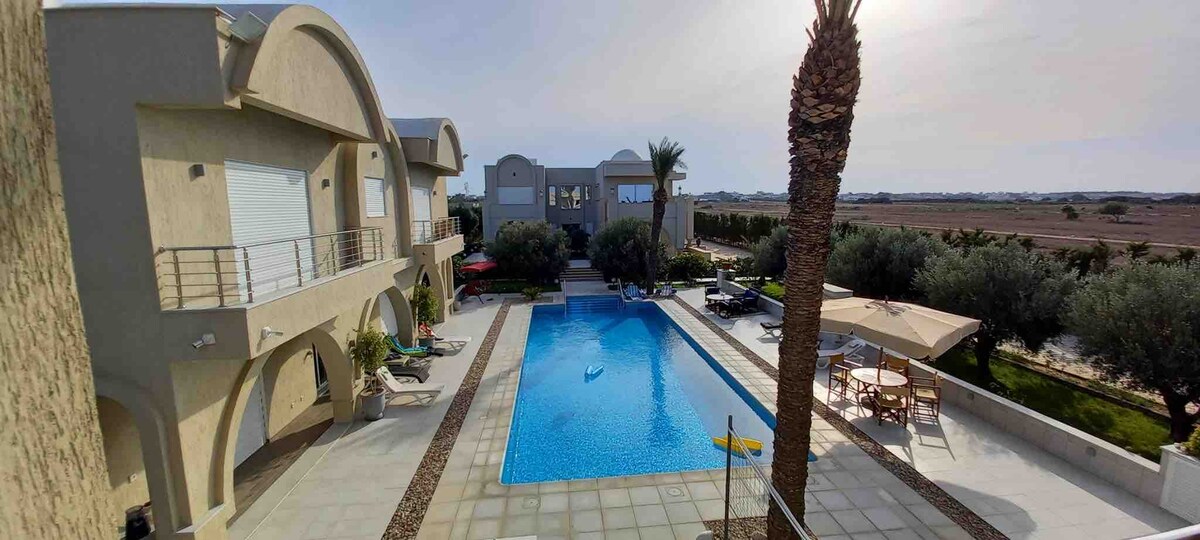 És una casa a la vora del mar, situada en un entorn natural preciós. Ofereix una àmplia sala d'estar amb aire condicionat, zona de llar de foc, menjador, suite principal amb aire condicionat i televisor i dos dormitoris més. La seva gran cuina està equipada amb microones, forn elèctric, fogons i nevera amb vistes al mar. La propietat està situada a només 5 minuts del jaciment arqueològic de Kerkouane, entre Kelibia i Haouaria.