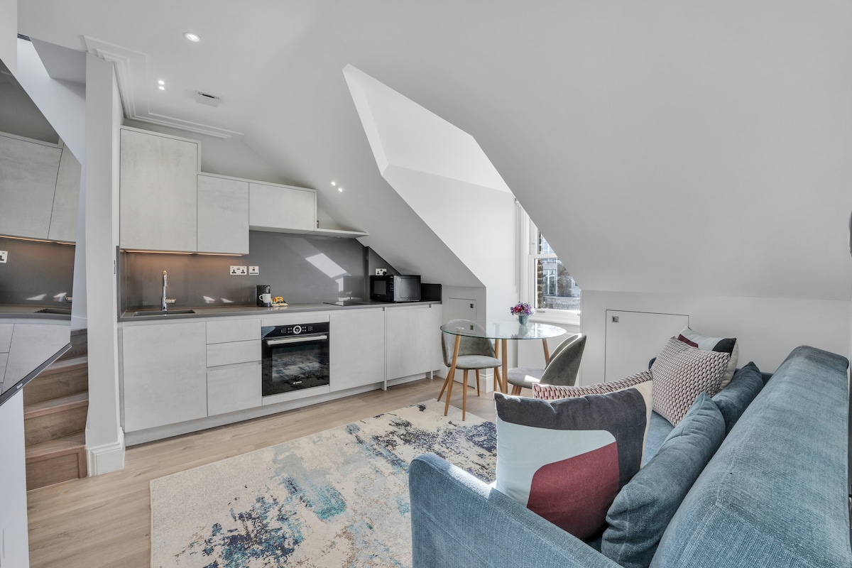📍High-spec newly built flat 1 min from tube. Premium features: Dramatic 4m ceiling living room, Starlink high-speed internet, wood floors, designer kitchen, Bosch appliances, spa bathrooms, underfloor heating, hot & cold air conditioning, smart TV, large wardrobe, double-glazed windows. etc. Sleeps 6, king beds, private entrance. Hampstead Village restaurants nearby. Perfect London base for families, professionals, tourists. Easy Central London access