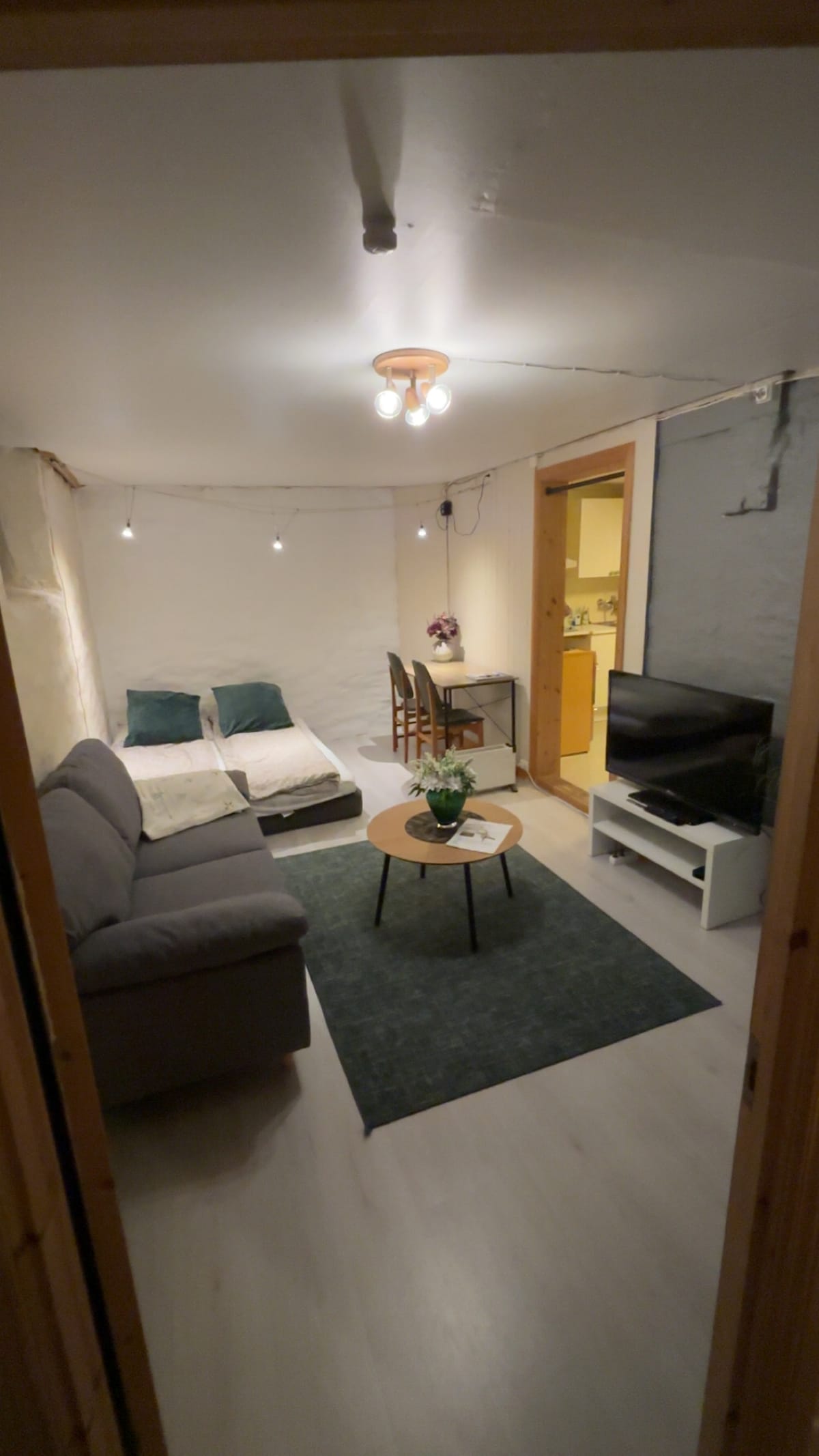 Dormitori amb llit de 150 cm d'amplada. Sala d'estar amb sofà 3+2 i taula de cuina amb 2 cadires. Cuina petita amb nevera a la sala d'estar. Bany amb dutxa i vàter. Entrada compartida amb la part principal de l'allotjament. 1,5 km fins al centre, agradable camí de senderisme al llarg del llac, a poca distància de l'església de Trondenes i del centre històric de Trondenes. Accés a un parc caní si es desitja. Banda ampla d'alta velocitat. Llit inflable addicional i llit de viatge per a nadons disponibles.