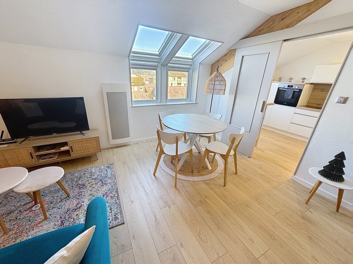 Pis acollidor, tranquil amb vistes a les muntanyes, situat a la 4a planta, incloent-hi 3 amb ascensor. Situat al cor de les botigues de Remiremont i a 800 m de l'estació de tren. Aparcament gratuït a prop. Consta d'una cuina equipada, un bany amb gran dutxa a peu, sala d'estar amb TV (Android), wifi, una entrada independent amb vestidor, una zona de dormitori amb llit de 160 x 200. Tovalloles i roba de llit. Per a les teves passejades, hi ha 2 bicicletes disponibles.