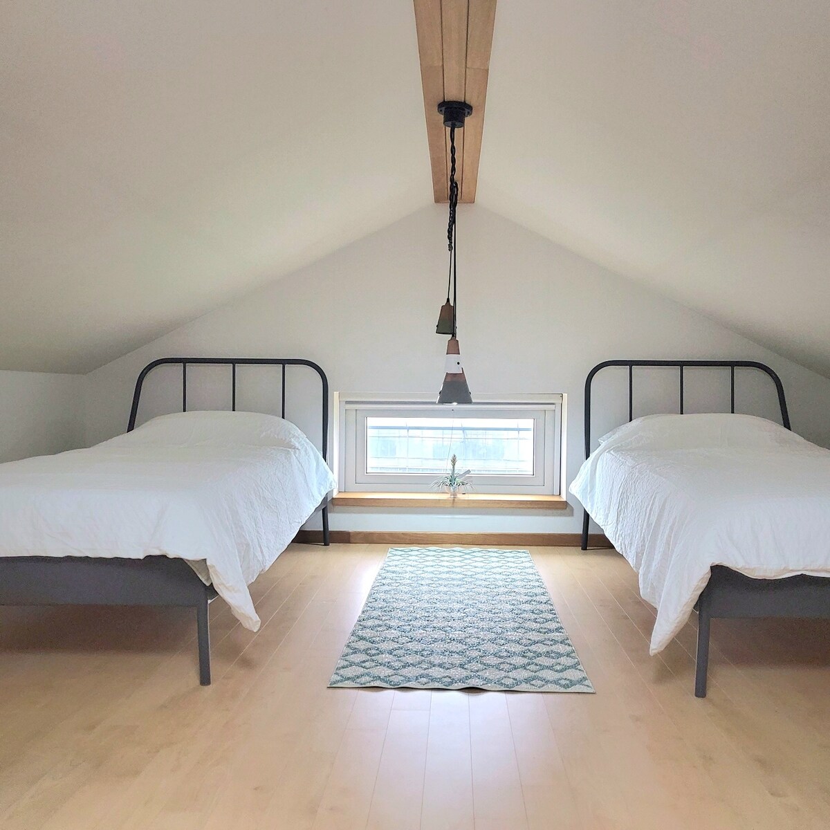 True to its name ("Stay Below the Mountain"), relax at our eco-friendly, custom-built "Red Brick House" while listening to the sounds of nature, right beneath Gunsan Oreum. Enjoy high ceilings, a cozy loft, and a private deck with Mt. Hallasan views & sunsets. ✨ 📍 Perfect Location • Located on Olle Trail (Route 9). • 3-min walk to Gunsan Oreum trailhead. • 2-min drive to the main road. 🔥 Amenities • BBQ, Fireplace (Bonfire), & Jacuzzi. • Stargazing at night. 💬 We are fluent in English!