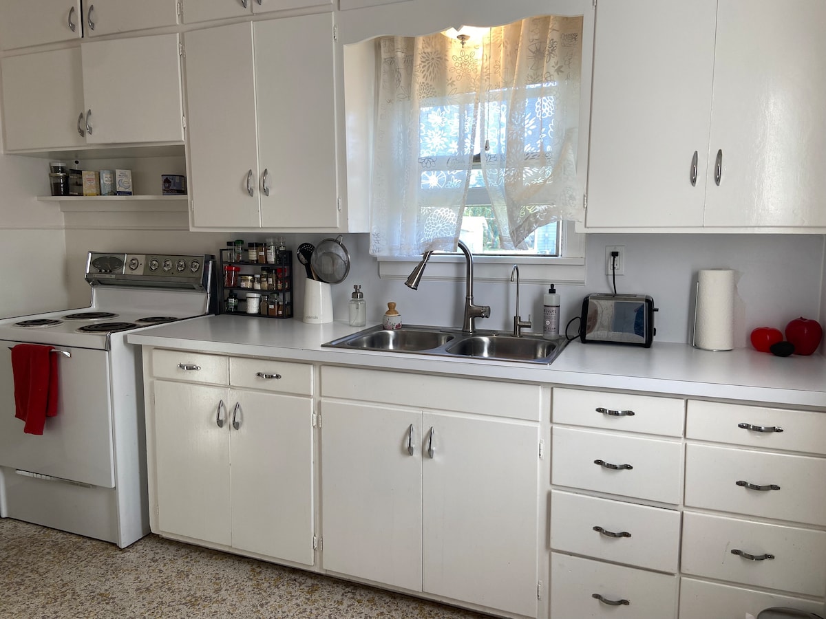 Si busques una experiència kitsch i divertida amb una decoració vintage real, l'has trobat! Aquesta agència d'assegurances dels anys 60, convertida en casa moderna de mitjans de segle, es troba a 1/2 bloc del carrer principal, a peu de menjar, compres i FHSU. Hi ha dos dormitoris i un bany, tots en una sola planta (sense escales!) amb una dutxa a peu i una pica blava vintage. Cuina amb cafè, estris de cuina i ous frescos de granja (de temporada). Tovalloles i llençols de cotó. Gaudeix del tocadiscs vintage i d'un joc de bar d'estil boig.