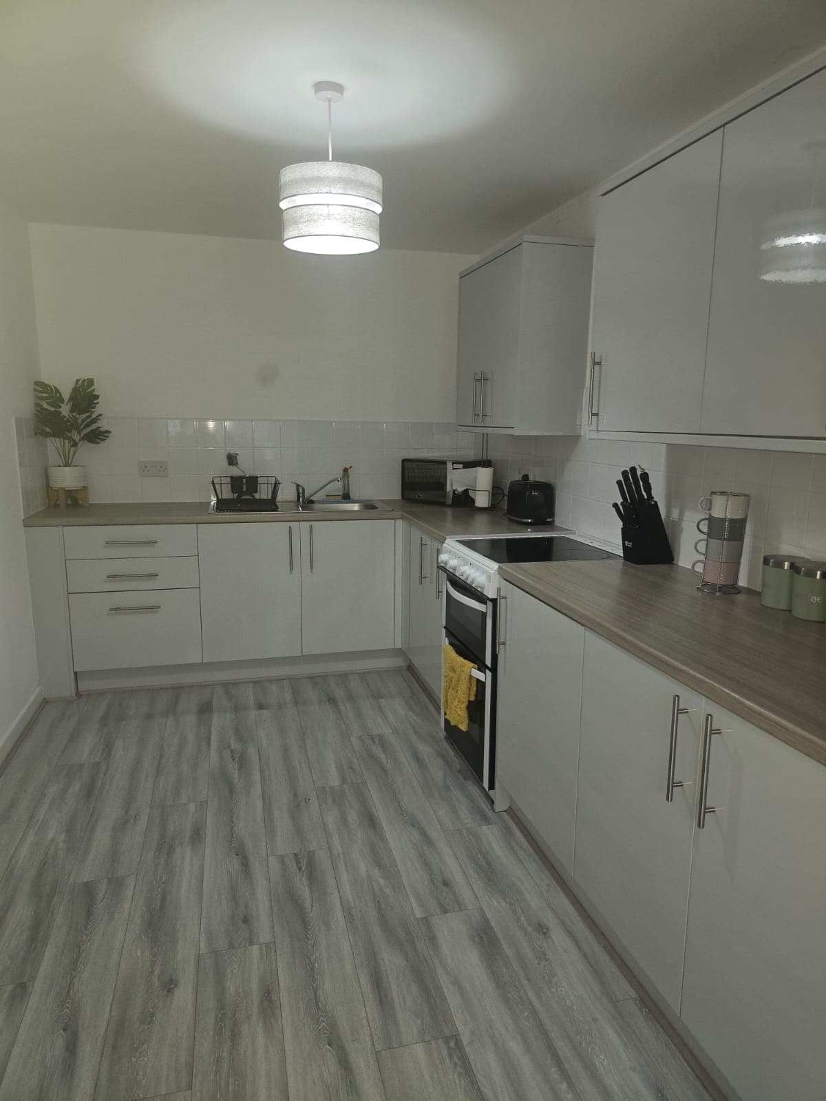 Es tracta d'un apartament de planta baixa i un dormitori recentment reformat, amb entrada privada i zona de jardí posterior. L'edifici es troba al cor de Cheadle. Molt a prop de botigues, restaurants, pubs i transport públic. A 10 minuts de l'aeroport de Manchester i a 20-25 minuts en cotxe de Manchester City. L'apartament té 1 dormitori acabat de decorar amb un llit doble còmode. L'espaiosa sala d'estar/cuina de planta oberta té un sofà llit, adequat per a 2 adults, però és un llit doble petit.