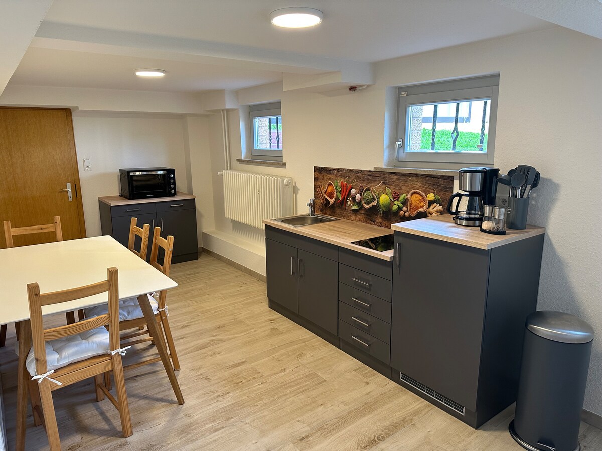 Petit estudi en plena natura amb uns 35 m2. A l'estudi trobaràs tot el que necessites; un llit doble gran i còmode, una cuina totalment equipada amb rentaplats, nevera, etc., un bany amb banyera i cabina de dutxa, una taula de menjador i una petita zona d'estar. Una gran vista llunyana des de les finestres del dormitori. També es pot fer servir un seient cobert al jardí. A 1,5 km es troba Schöllkrippen amb totes les oportunitats de compres.