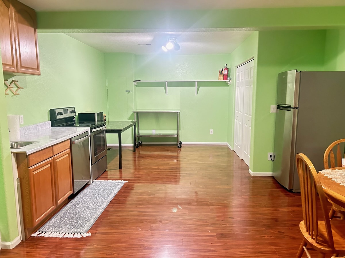 Soak up in the hot-tub, sit by the firepit, and enjoy a nice night of slumber in our SOLAR powered home with car charging. Stay at the lower level of our renovated house. It has 3 BR and 2 BA(1King, 2Queens). You can see some mountains from the hot tub during winter. We have fast internet, a kitchenette, washer-dryer. ~30 minutes away from the Lookout mountains and the Red Rocks. Parking is available in the driveway/street. We live in the upper half. No need to take out trash at check out.