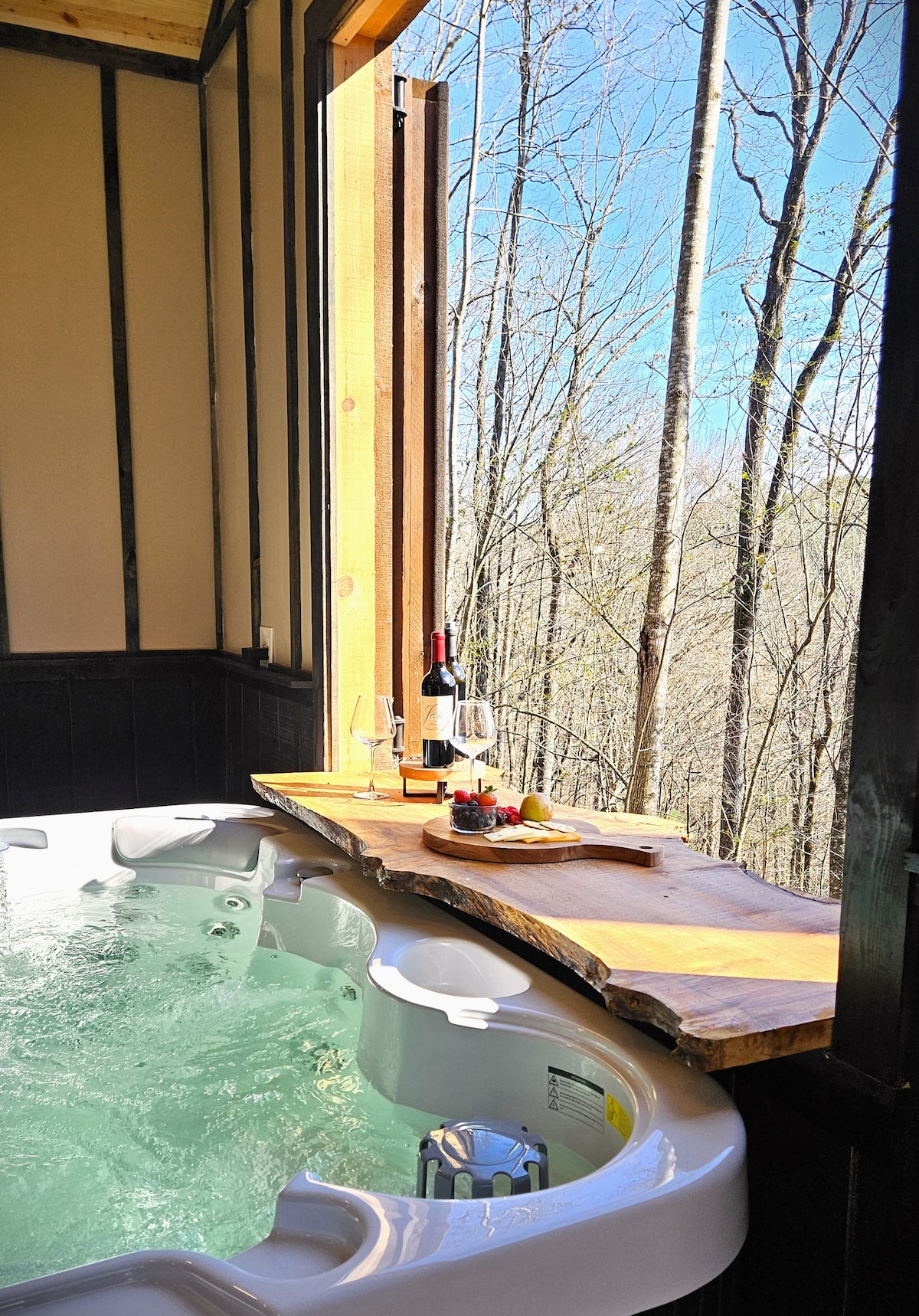 Descobreix una joia a només 9 minuts del centre de Dahlonega:una cabana de vidre situada en 3,5 hectàrees privades al cor de la regió vinícola. Gaudeix de les vistes del terra al sostre des de totes les habitacions. Situat en una famosa zona de ciclisme, pedaleja a través de rutes panoràmiques des de la porta. A només 6 milles de l'emblemàtic Appalachian Trail, és una fusió de luxe i bellesa natural. Submergeix-te en vinyes de primer nivell o busca una aventura il·limitada a l'aire lliure. Un refugi inigualable al bosc serè de Dahlonega t'espera.