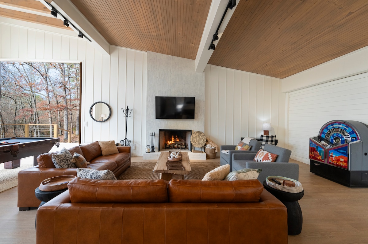 Tuklo Tiak, Choctaw per a "Two Pines", és una cabana de luxe enclavada entre pins, que ofereix el refugi perfecte per a parelles. Amb xemeneies interiors i exteriors, banyera d'hidromassatge, sauna i foguera, ofereix relaxació i connexió. Situat entre Broken Bow i Hochatown, ofereix privacitat i tranquil·litat, però està a minuts de restaurants, botigues i atraccions. Gaudeix d'una escapada tranquil·la que voldràs tornar a visitar, amb tots els detalls dissenyats per a la comoditat i la serenitat, perfectes per crear records duradors.