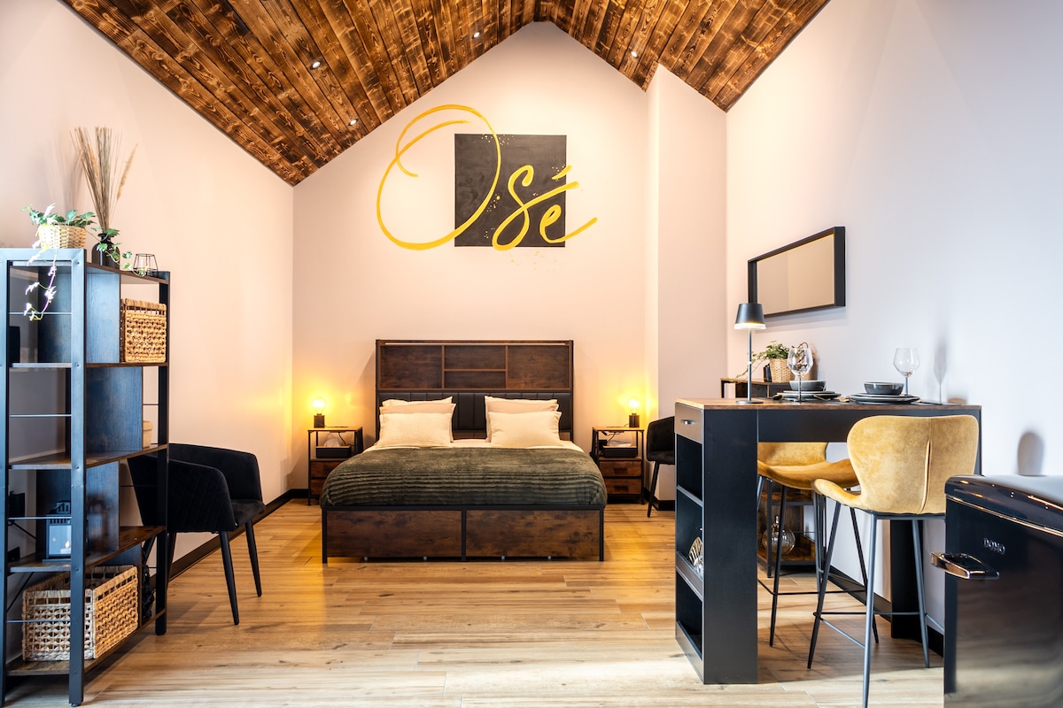 Loft L’Atelier, 75 m² sur 3 niveaux, décor industriel chic. Idéal pour une escapade à deux avec petit déjeuner inclus. Équipements : lit extra king size, sauna infrarouge, baignoire balnéo, grande douche italienne, cuisine équipée, salon avec TV XL et son surround. Terrasse ensoleillée avec BBQ. Situé face aux étangs du parc à gibier, aux portes de la forêt d’Anlier. Un lieu unique pour se détendre et profiter pleinement de la nature.
