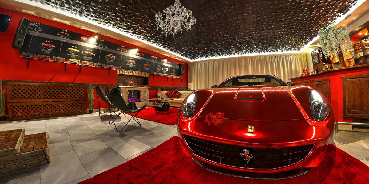 Ubytování v zážitkovém samoobslužném apartmánu s vozem Ferrari: - Manželská postel pro 2 osoby + 2x přistýlka - Vůz Ferrari California 30 Edition - Koutek nejúspěšnějšího jezdce Formule 1 - Sbírka certifikovaných modelů Ferrari - Simulátor vozidel včetně Ferrari - Vířivku - Saunu - Kulečník - PS5 - Vlastní koupelnu s wc - Ložnici - Vybavenou kuchyňku s mikrovlnkou, kávovarem, rychlovarnou konvicí, indukční deska, minibar/lednička - Zahrádka s venkovním posezením s živými rostlinami - Sedačku