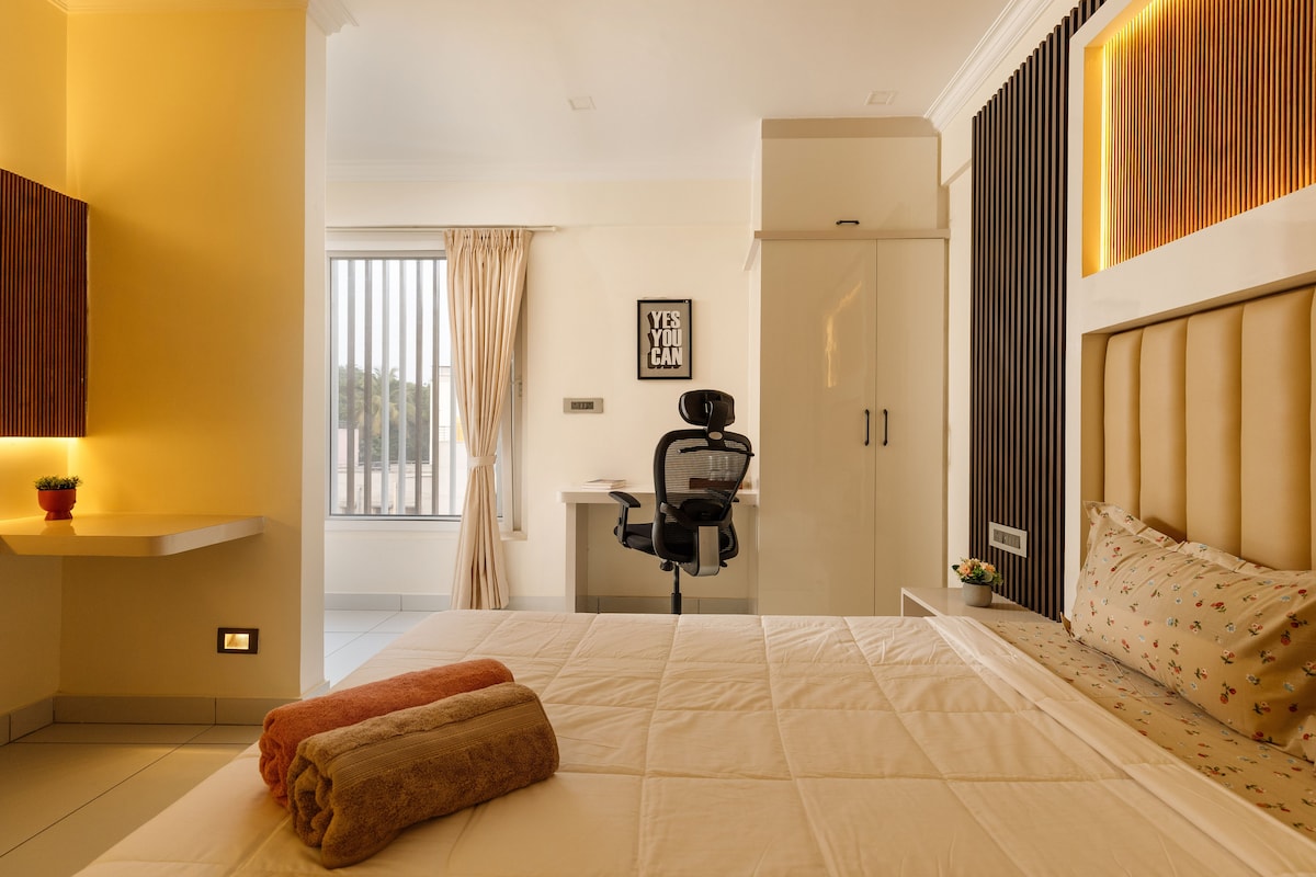 Amplia suite 1BHK de dissenyador de 600 peus quadrats amb balcó privat | Wifi de fibra òptica d'alta velocitat i televisor intel·ligent amb plataformes de streaming, escriptori de treball/menjador, suport elèctric les 24 hores per a treball i comoditat ininterrompudes | Llit King i matalàs ortopèdic Luxe, armaris de fusta per a l'emmagatzematge | Cuina petita totalment equipada | Sofà llit a la sala d'estar , ocupació màxima 4 | Accés a l'ascensor, neteja professional i accés a bugaderia de pagament a l'allotjament per a estades llargues| Situat a Central Bangalore | LGBTQIA++ Afirmatiu