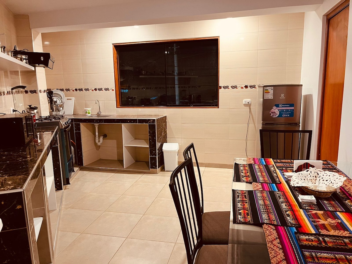 Encantador departamento céntrico en Caraz, a pocos pasos de la Plaza de Armas, perfecto para viajeros solos que quieren moverse caminando y sentirse como en casa. El barrio es tranquilo, con mercados, restaurantes y transporte hacia los atractivos del Callejón de Huaylas muy cerca. El espacio es práctico y acogedor, ideal para descansar después de explorar la sierra ancashina. Cuenta con cocina equipada, wifi y ambientes cómodos para relajarte, trabajar o planear tus rutas del día siguiente.