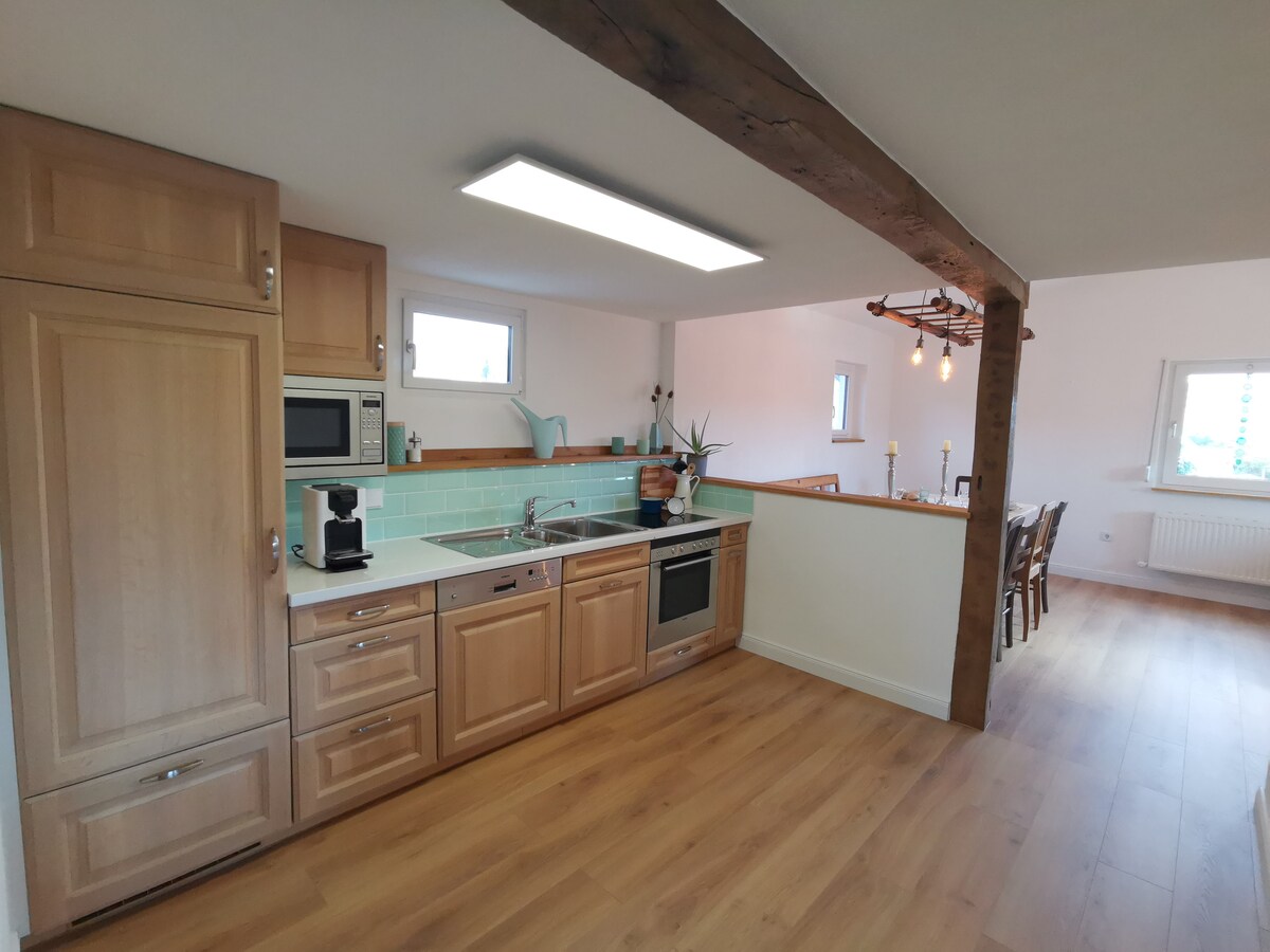 The apartment was lovingly renovated in 2021 and has 110m² (at full occupancy), with 3 bedrooms, 1 bathroom, kitchen, dining area, spacious living area and a hallway. The apartment is located in a beautiful old farmhouse with an inner courtyard. A special feature is the free WLAN with a maximum speed of 1000 Mbit/s.