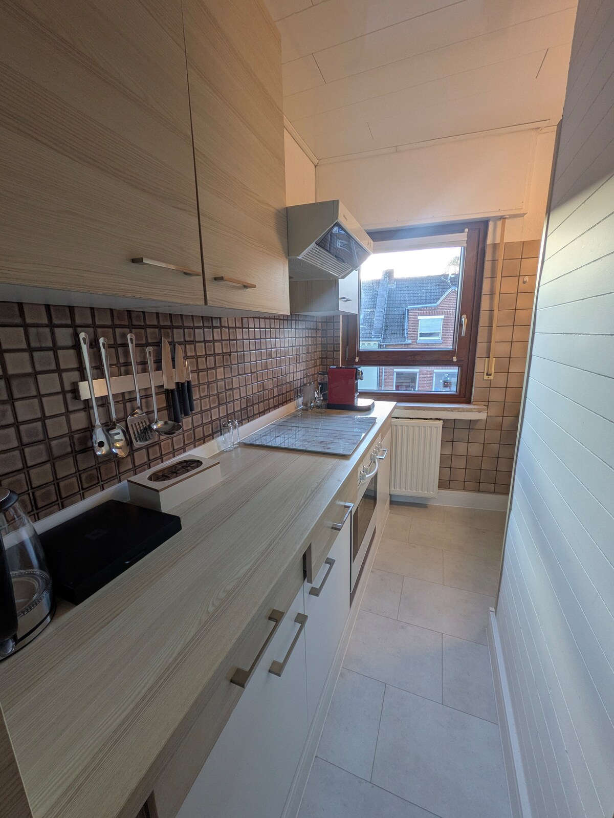 Et dono la benvinguda al meu preciós pis nou a les portes de Colònia. Un ambient amable i d'alta qualitat t'espera després d'un dia ple de esdeveniments. A la cuina ben equipada pots preparar un petit àpat tu mateix. A les cadires de cinema nostàlgiques, pots relaxar-te mentre veus la televisió o llegint. Una bona nit de descans està garantida pel llit equipat amb un matalàs d'alta qualitat i un cobrellit.