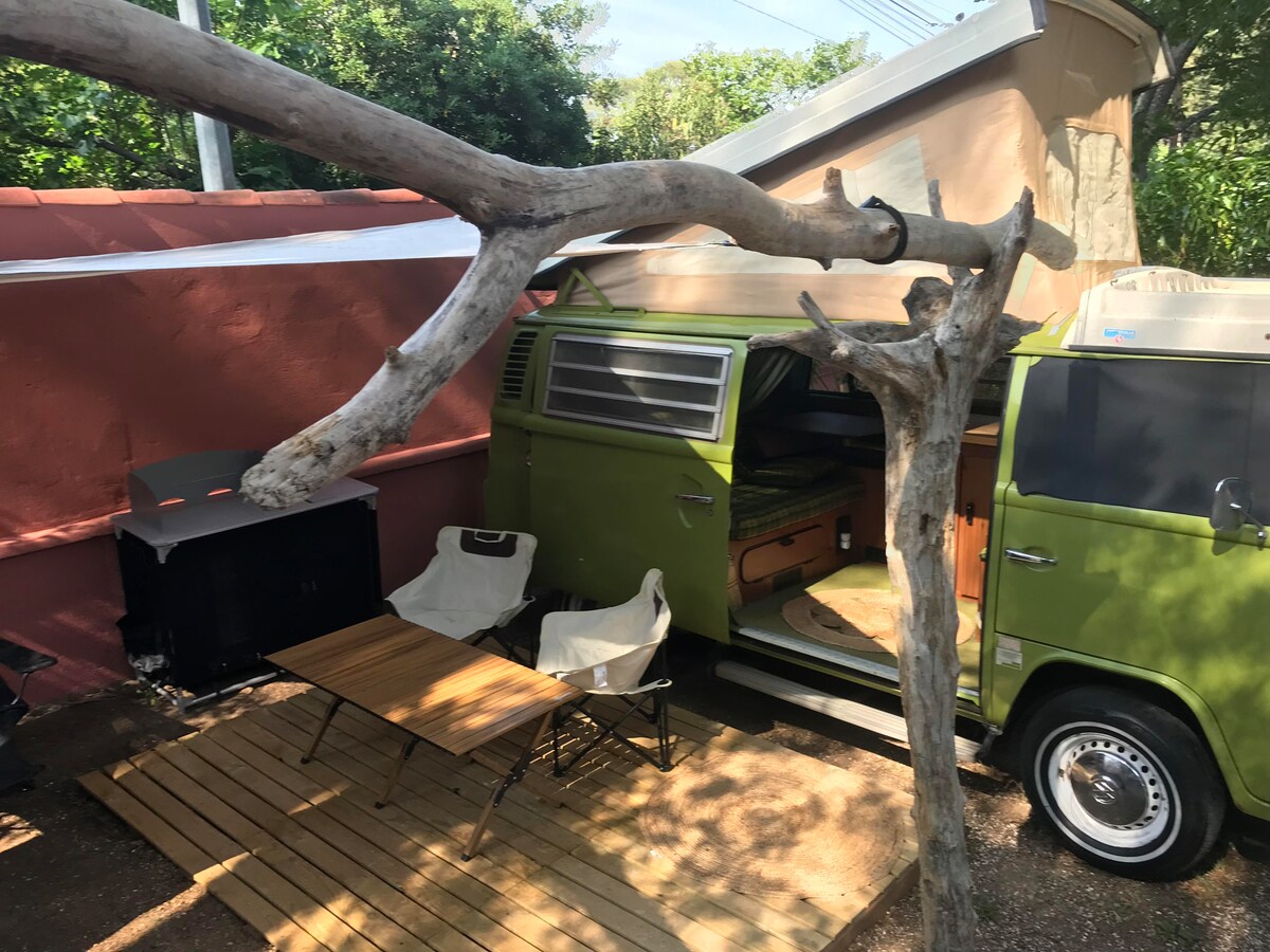 Vivez l'expérience Vanlife dans un camping familail à Le Pradet en bord de mer entre Toulon et HYères, Plage et centre ville à 300m à pied Location fixe d un authentique Combi VW T2 de 1970 Magnifique terrasse bohême équipée ,Coin cuisine , cuisson et eau froide Hamac 2 personnes Draps inclus Douche et Wc au sanitaire commun du camping Piscine, Snack et animation (haute saison) En supplément, location de paddle et kayak sur place Espace jacuzzi et massage sur RDV