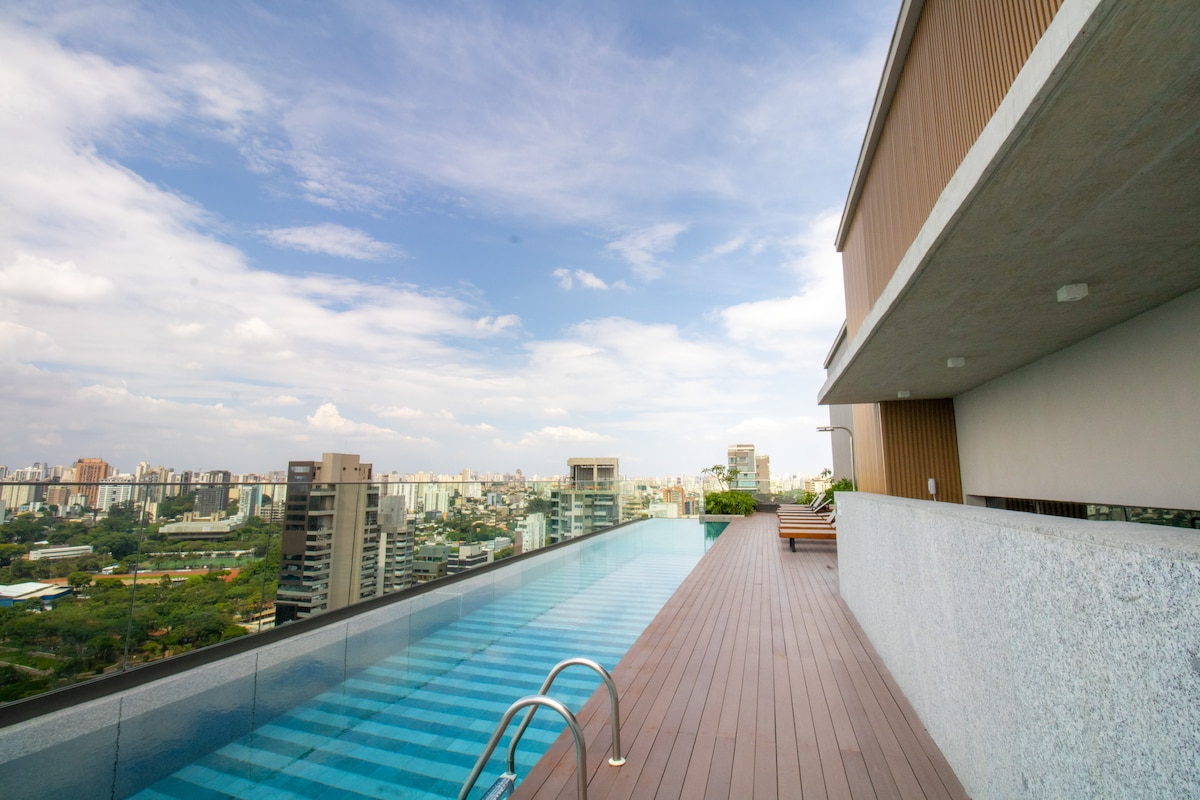 Welcome and make yourselves at home. The apartment is brand new, designed especially for you and has impeccable decor, very practical for everyday life. The view is spectacular! The apartment is on the 28th floor. We are in an excellent location in São Paulo, in the Pinheiros neighborhood, with restaurants, supermarkets and bakeries very close by. It's 40m2 (430 sqft) with 1 bedroom and 1 bathroom. Walking distance from Fradique Coutinho subway station (just 2 blocks).