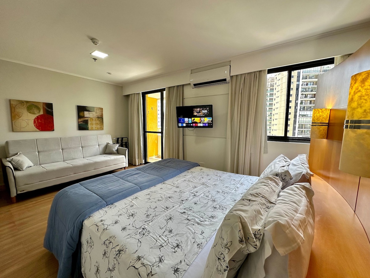 Flat de 1 quarto e ante sala, confortável com ótima localização com duas camas: opção de duas camas de solteiro que juntas se torna uma cama King. O sofá cama é para reserva com 3º hóspede. Limpeza diária, recepção 24 horas, estacionamento gratuito, academia, sauna, piscina. Restaurante no prédio (custo extra). Local super seguro/rua tranquila. Próximo ao Parque Ibirapuera (700m), Ginásio Ibirapuera (150m), Av. Paulista/metrô ( 1 km) supermercado, farmácia, restaurantes, clínicas.