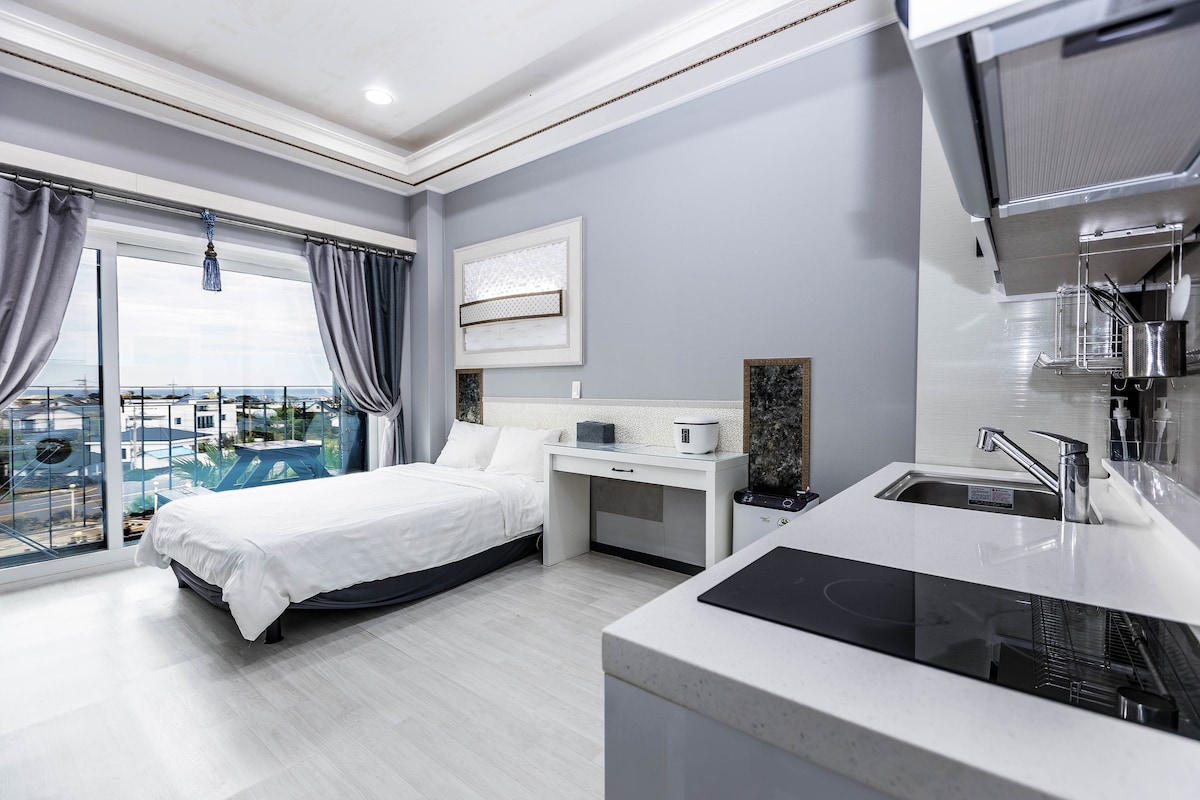 Aquest és un petit allotjament de tipus hotel a Dongbok-ri, un petit poble de Jeju. És un allotjament tranquil on pots trobar el mar que sempre és agradable en totes les estacions. Des de qualsevol habitació, pots gaudir de la vista al mar, al camp i al London Bagel Museum junts.😊 És un allotjament acollidor i net, amb l'esperança que t'hi quedis feliç en un espai còmode amb la família, els amics i els amants.