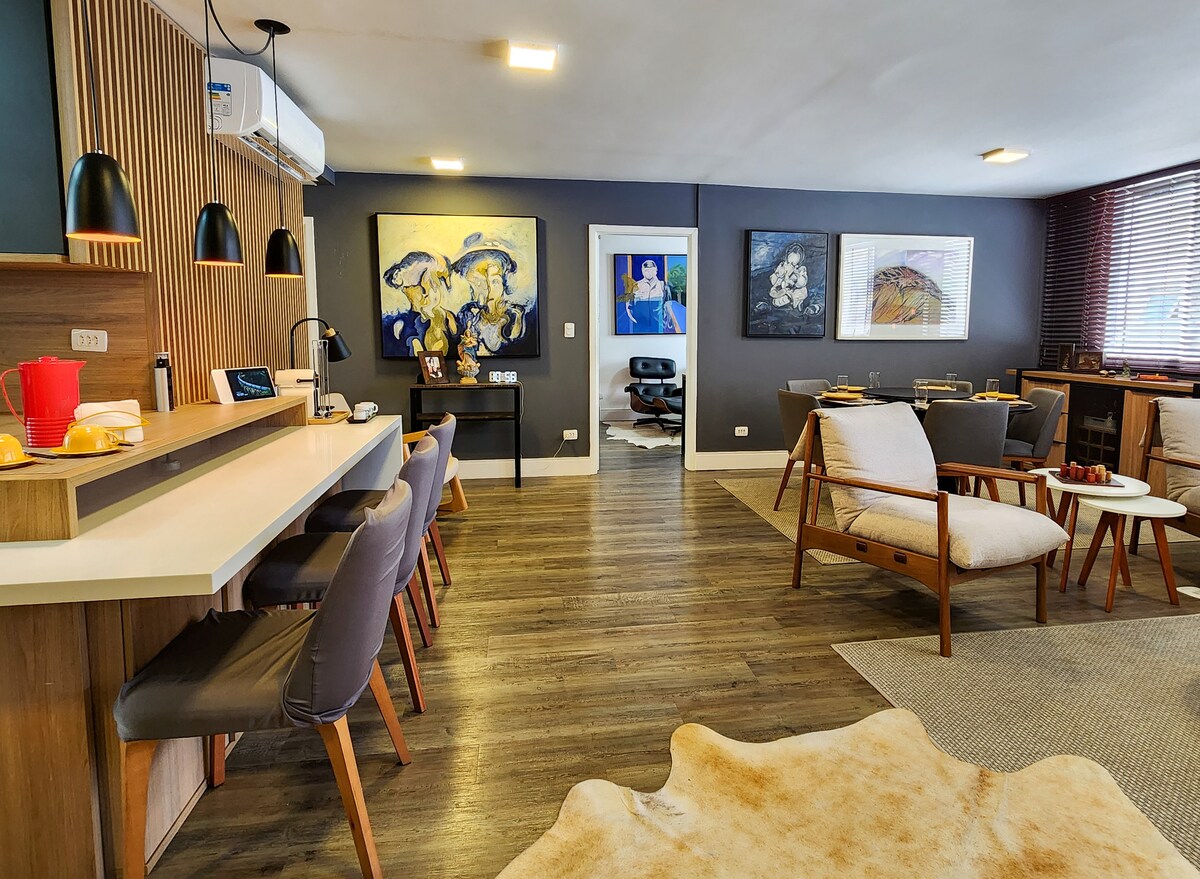 Una autèntica obra d'art al millor barri de Curitiba! Aquest apartament és la llar d'un arquitecte amb molt de gust que es va prendre un any sabàtic per viatjar pel món amb la seva furgoneta, des d'Ushuaia fins a Alaska. Mentrestant, va presentar als visitants de Curitiba aquesta obra mestra! > Estades de més de 90 nits Suite amb llit «queen size» > Oficina "nerd zone" reversible per a suite, llit doble retràctil > Sofà llit a la sala d'estar > Capacitat per a 6 persones > A/C a tots els entorns > 1 plaça d'aparcament