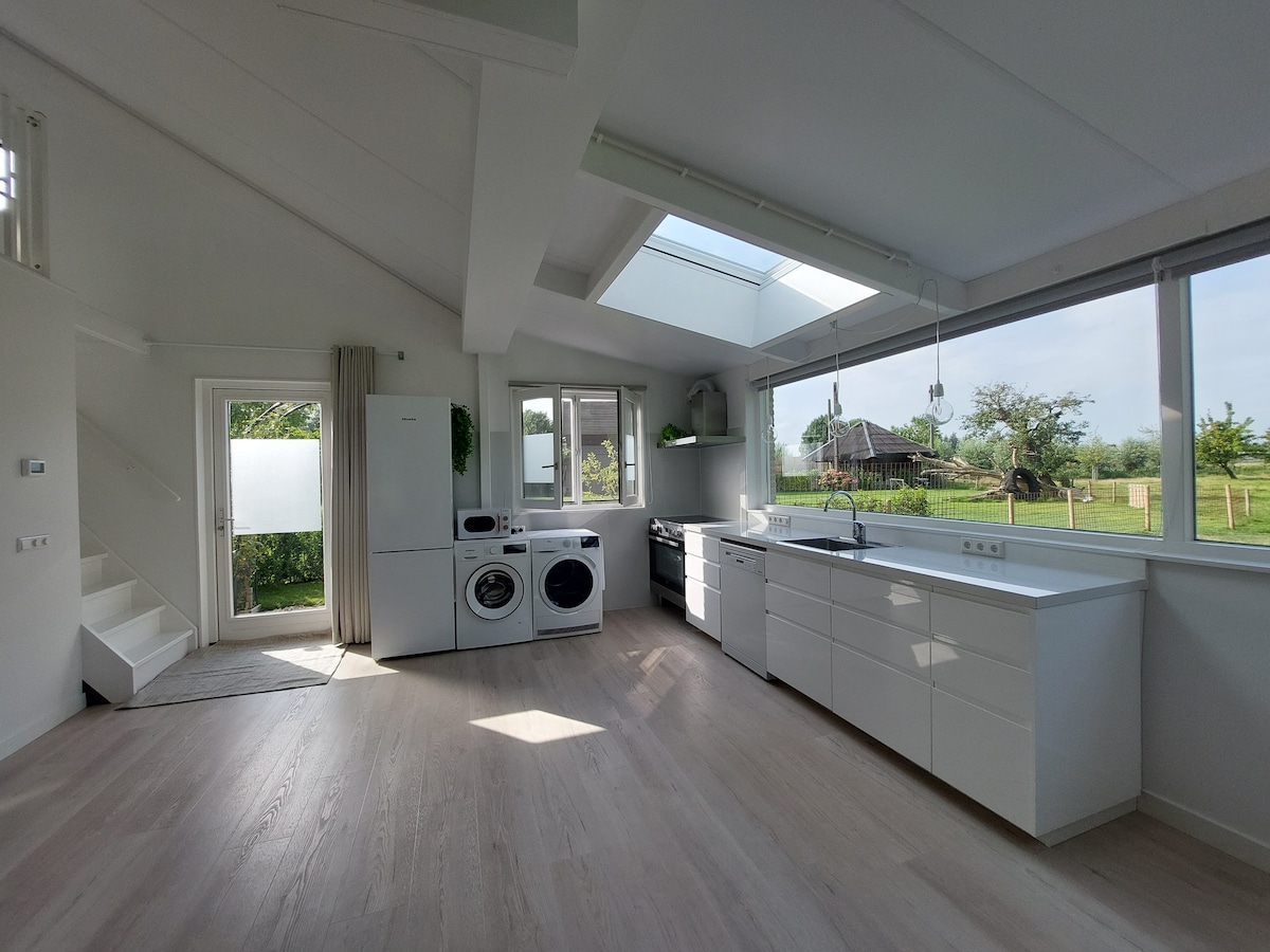 Gaudeix d’espai i tranquil·litat a la nostra luxosa caseta per a convidats (100 m²) amb una sala d’estar acollidora, 4 llits còmodes i una terrassa privada amb vistes al hort. Casa rural totalment equipada amb cuina, bugaderia i assecador i wifi ràpid. Vistes panoràmiques dels prats, però en una ubicació cèntrica: Utrecht a 20 minuts, Amsterdam a 30 minuts. Perfecte per als qui volen relaxar-se al camp tenint la ciutat a tocar!