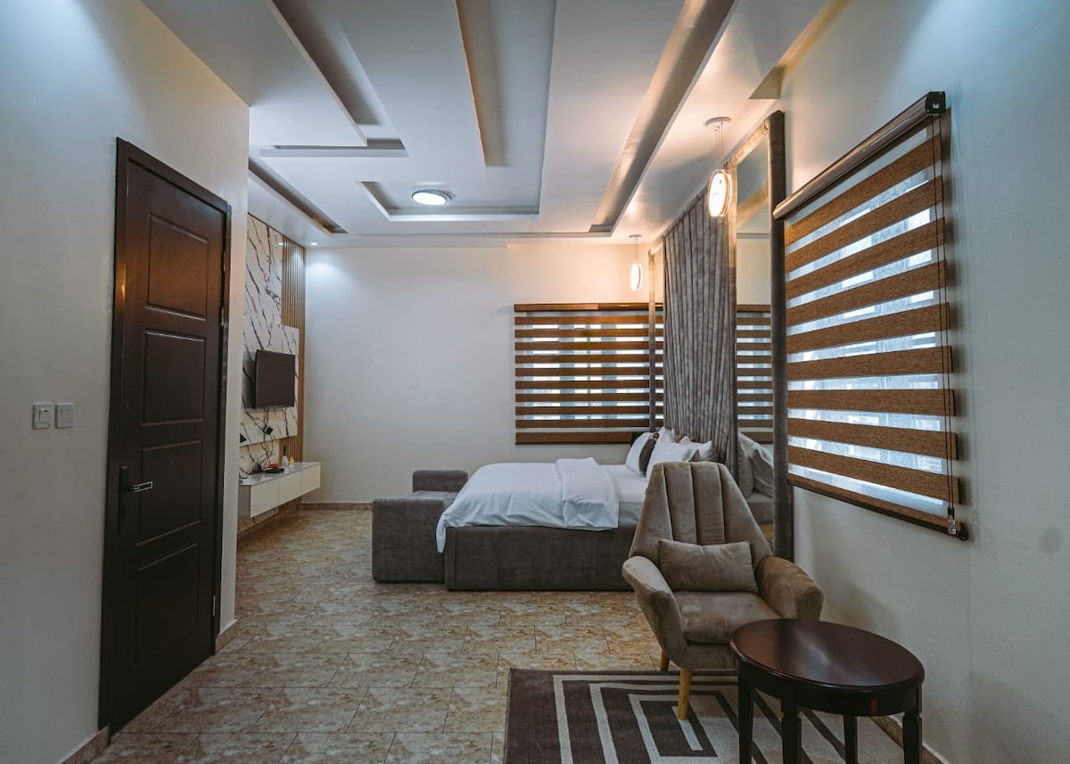 Habitació estàndard amb bany privat amb matalàs còmode semi ortopèdic de mida «king size», bany modern amb escalfador d'aigua. WIFI ràpid il·limitat, televisor intel·ligent de 43 polzades al dormitori i televisor intel·ligent de 55 polzades a la sala d'estar, Netflix, YouTube, DSTV, detector de fum, electricitat les 24 hores amb Banda A subministrament a la xarxa fa que el meu allotjament sigui únic sense apagat, Cctv, màxima seguretat, a 10 minuts de l'aeroport internacional i a 5 minuts de l'aeroport nacional. Pis net, espaiós i ben organitzat per a la teva comoditat