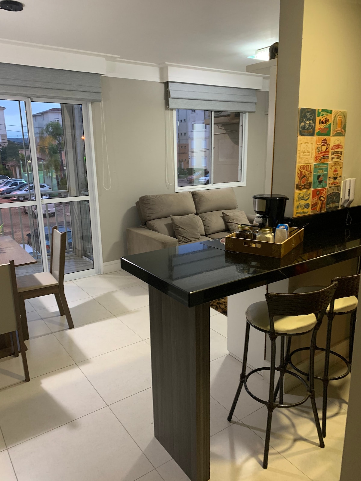 Pis còmode i ben situat, amb 2 dormitoris, 1 bany i 1 plaça d'aparcament. A 7 minuts de l'aeroport (3,5 km) i a 5 minuts en cotxe del restaurant més proper (2,5 km). A prop de l'aeroport, Grêmio Arena, fleca, mercat i amb un parc davant del condomini. Neteja ambient, amb 250 mega wifi, nevera, microones, forn elèctric, aire condicionat dividit, rentadora, llits d'alta qualitat i dutxa de gas. El condomini també té una botiga de queviures.