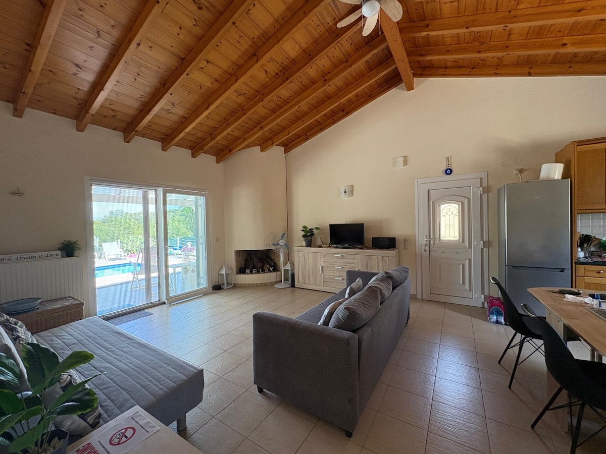una casa unifamiliar única dins d'un oliverar de 12000 metres quadrats amb una piscina impressionant amb vistes al mar, relaxa la teva ment amb la tranquil·litat de la natura. i prendre el cafè o el còctel amb vistes al mar Jònic. l'allotjament conté tot el que necessites, cuina totalment faccional,rentadora i assecadora,rentaplats, planxa i assecador de cabells. la casa és l'opció perfecta per a parelles,i per a famílies petites o un parell d'amics, ja que podem reorganitzar el sofà com un llit doble molt espaiós.