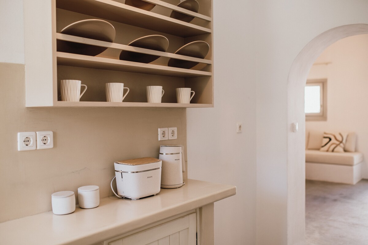 Create unforgettable moments with family or friends in your spacious outdoor area with jacuzzi or relax in your indoor living room. One bedroom suite of 45 sqm suitable for up to 5 guests. It has a queen size bed kai 3 single stone design beds, bathroom with rain shower equipped kitchen, 2 balconies Smart TV and v.fast wifi is provided in all areas The distance from the port of Ios is 2 km as well as to the beach of Mylopotas. The old town of Ios is only 150m away
