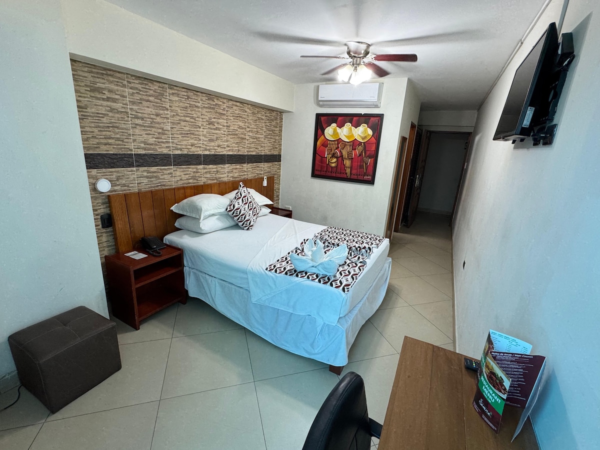 Habitació còmoda, amb aire condicionat, TV, bany propi, aigua calenta i freda, disposem d'un petit restaurant en el qual s'ofereix esmorzar americà, el nostre entorn té una piscina, grans zones reforestades. Estem al centre de l'Av abelarde quiñones que connecta l'aeroport i el centre de la ciutat, anant en moto estem aproximadament entre 15 i 20 minuts del centre de la ciutat i de l'aeroport.