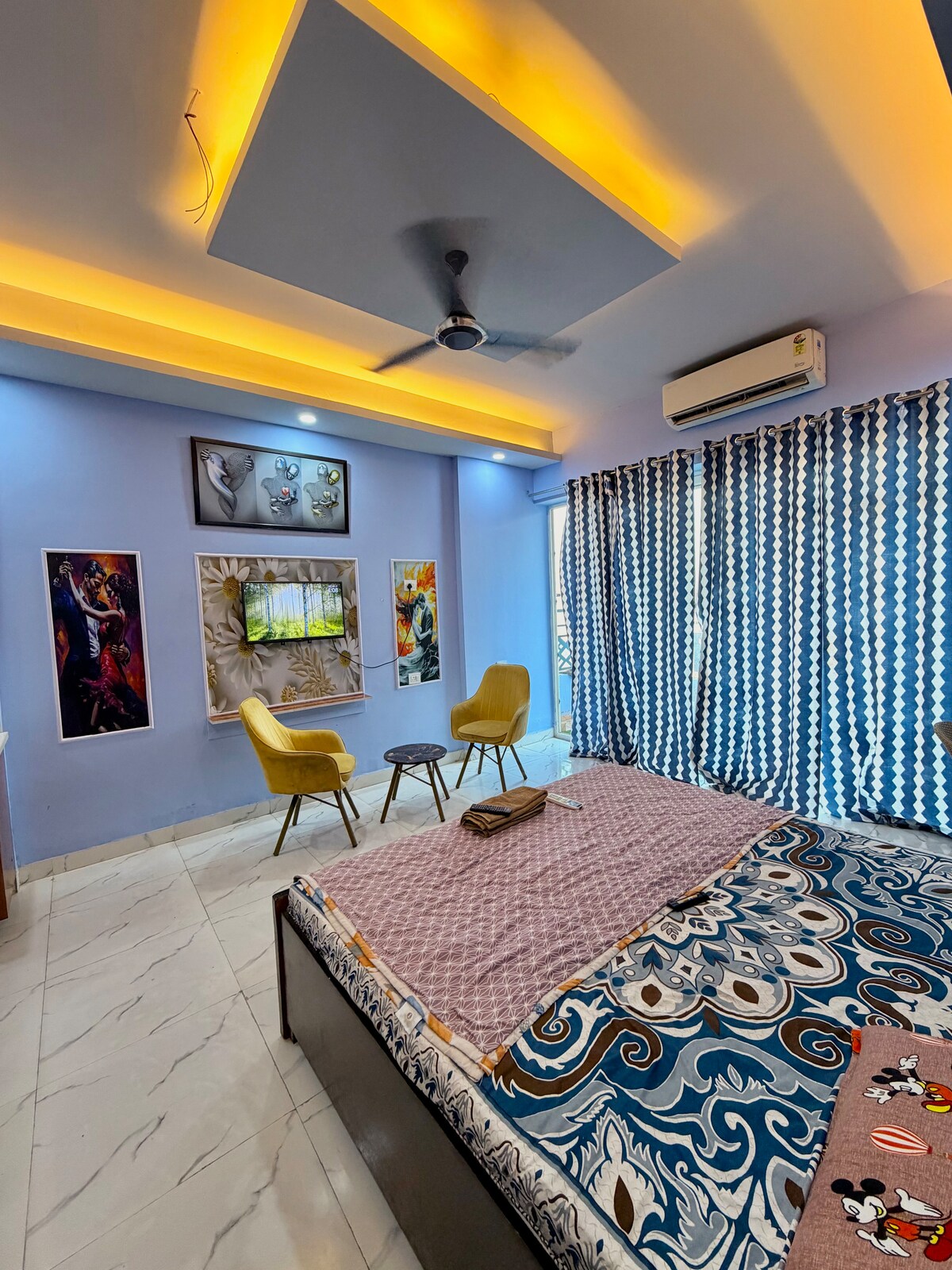 Welcome to this beautifully designed studio apartment located in the heart of Greater Noida West. Perfect for solo travelers, couples, or business guests, this studio offers a comfortable stay with all modern amenities. What You’ll Love: Spacious, well-lit room with a luxurious queen-sized bed. Elegant ceiling design with ambient lighting and stylish fans. Smart TV with entertainment setup and cozy seating. Air-conditioned comfort. Private balcony. Refrigerator. Clean, modern bathroom.