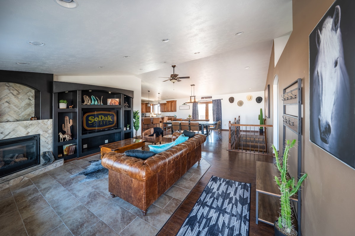 “RVR” is 5 peaceful acres in the country overlooking the Sioux River valley, just 3 mi north of the Sioux Falls city limits & I-29/I-90; 4 & 5 mi straight north of the Sanford Pentagon & Premier Center. Guests enjoy a SUNRISE each morning from all 5 bedrooms, the 30’x40’ common area Great Room/Kitchen, lower level British pub & parlor, 14’x40’ patio, 12’x40’ deck, covered deck, enclosed porch, & the 12’x16’ back deck. The last breath of every SUNSET is seen from half of those areas! Enjoy!