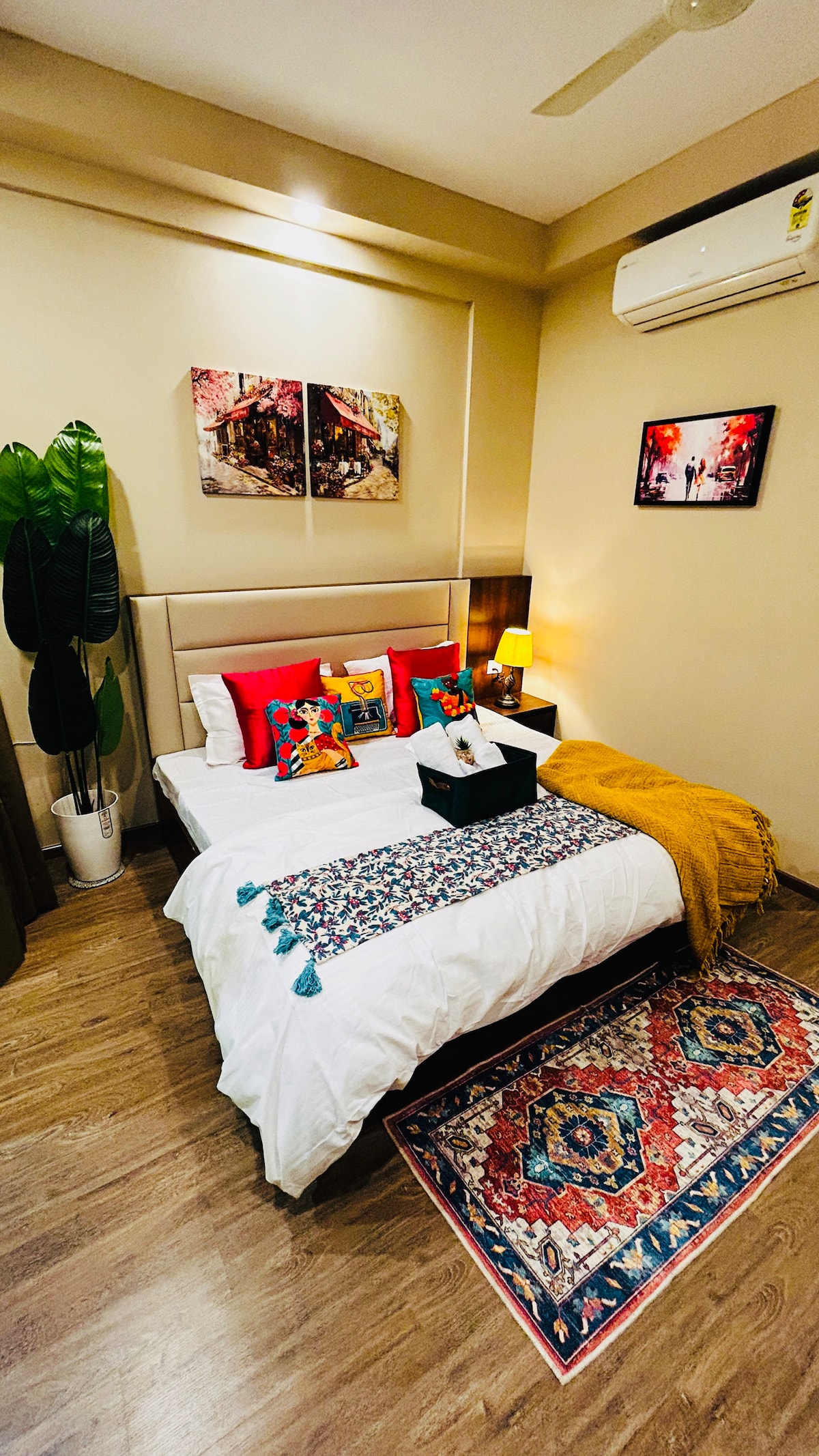 Relaxa't i relaxa't en aquest preciós pis bohemi a la preciosa Gran Noida. Està dissenyat amb estil i equipat amb tot el que necessites per gaudir d'una estada refrescant. Els dos dormitoris estan equipats amb dos llits «king size» i dos llits nusos individuals que permeten que fins a 6 hostes s'allotgin còmodament. Els dos dormitoris tenen banys complets adjunts. També hi ha una cuina equipada per a totes les teves necessitats de cuina. La gran terrassa és un lloc perfecte per gaudir de nits fresques d'estiu i crear records amb els teus!