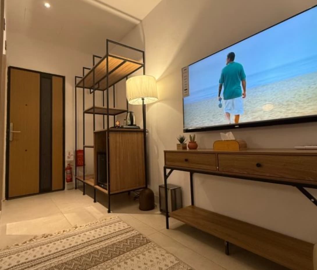 شقة أنيقة ومجهزة بالكامل، صُممت بعناية لتوفر إقامة مريحة وهادئة تناسب العائلات والأفراد. تتميز الشقة بتصميم عصري وإضاءة ممتازة تعكس إحساسًا بالرحابة والنظافة، مع توزيع عملي للمساحات يلبي احتياجات الضيوف اليومية. تتكون الشقة من: • غرفة نوم مريحة بسرير مريح وخزائن تخزين مناسبة. • صالة معيشة أنيقة مجهزة بجلسة مريحة وتلفاز، مثالية للاسترخاء. • مطبخ متكامل يحتوي على الأدوات الأساسية (ثلاجة، ميكروويف، مستلزمات القهوة والشاي ). • دورة مياه نظيفة وعصرية مع مستلزمات أساسية.