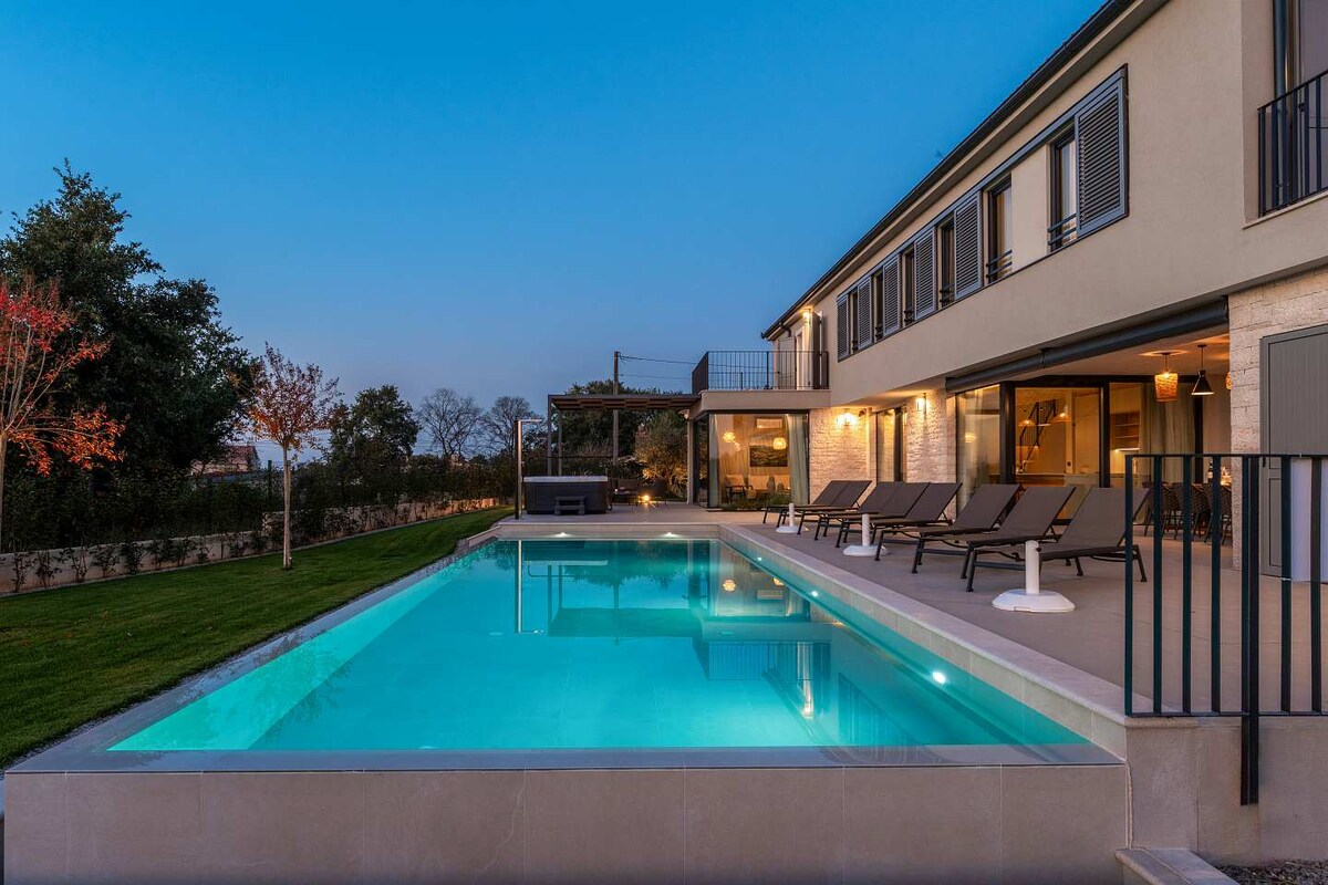 Villa amb estil a prop de Rovinj amb piscina digna de fotografia, banyera d'hidromassatge enfonsada i sauna. Desperta't amb unes vistes panoràmiques exuberants de la vall. Ideal per a parelles i famílies, a poca distància en cotxe del parc d'aventures, el parc nacional de Brijuni, el parc de dinosaures, pobles medievals i gastronomia local. És una autèntica escapada verda per a qualsevol persona que vulgui tornar a la natura amb tota la comoditat de la vida moderna. Totalment equipat per a la cuina i l'entreteniment en 2600 m2 de jardí (futbol, pilota de velocitat, bàdminton i diversió a la piscina) per gaudir dels teus fills i els teus estimats.