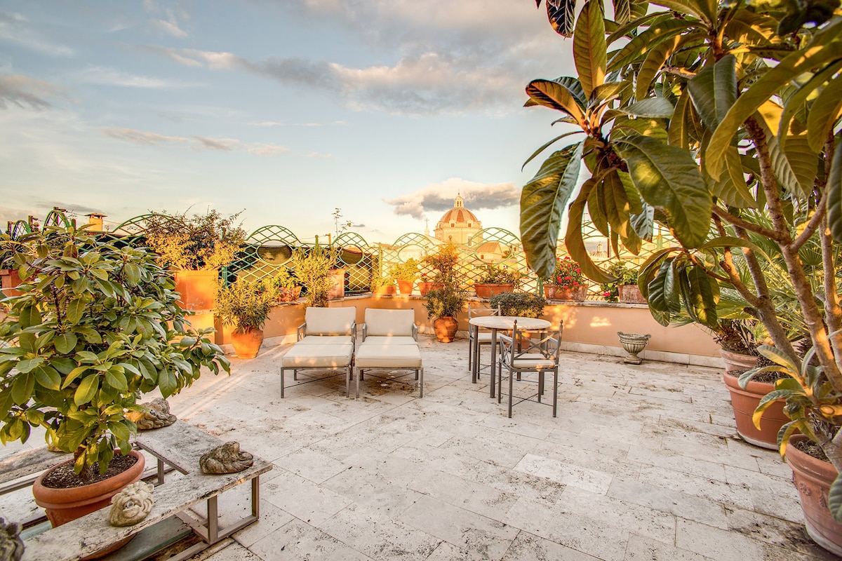 Àtic fabulós i galeria d'art VISTA IMPRESIONANT SOBRE LA CIUTAT HISTÒRICA ANTIGA DE ROMA, AMB 200 M² DE TERRASSOS PRIVATS IMPRESSIONANTS amb vistes a tots els monuments més famosos, esglésies i llocs antics romans. INTERIORS DE LUXE i contemporanis Cuina a cada nivell, Habitació principal romàntica amb una vista magnífica de l'Altare della Patria, un pati encantador i la gran cúpula de l'església de Sant Carles ai Catinari sobre l'increïble i impressionant panorama de la terrassa del terrat!