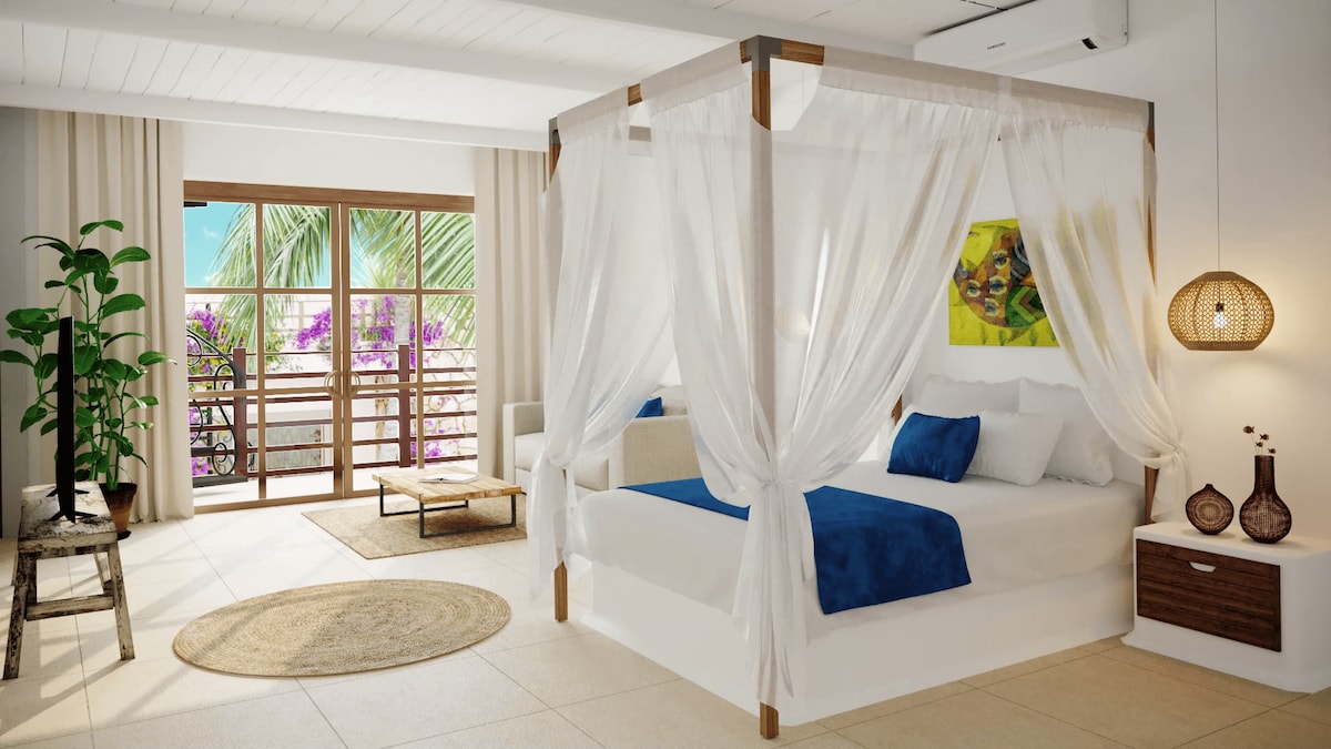 Aquesta categoria és a la planta baixa de l'hotel El pis està preparat per allotjar quatre persones. Construïda amb dues habitacions separades, una suite «king size» i una sala d'estar amb dos sofàs llit i un pati amb hamaca. L'apartament està equipat amb aire condicionat, televisor intel·ligent, caixa forta per a minibar i un pati privat on pots gaudir d'moments tranquils i agradables. Gaudeix de la teva estada en aquest quàdruple pis de la planta baixa on la comoditat i la privacitat es troben.