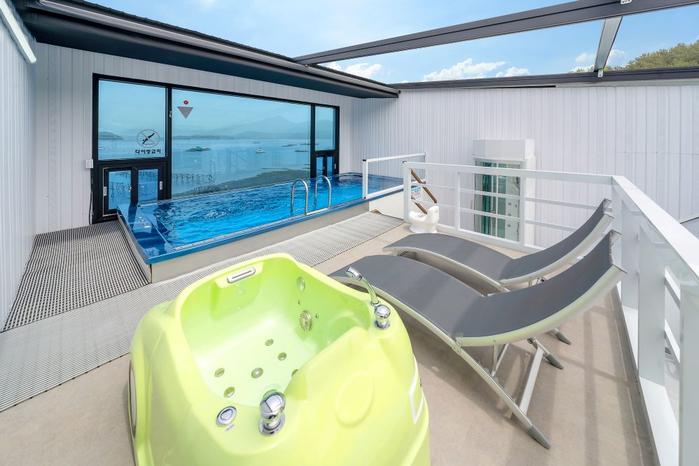 Torna a obrir l'abril de🎉 2023!!🎉 Renovat amb una remodelació de l'habitació completa i l'addició d'una piscina infinita: D Es troba a l'illa de Changwang, una petita illa de les dues illes del mar de Namhae, per la qual cosa pots venir còmodament sense trànsit de camí a l'illa principal, i la ubicació és bona perquè està a uns 15 minuts en cotxe de les atraccions turístiques de Namhae. Què et sembla descansar en un lloc on quedin mars del sud?