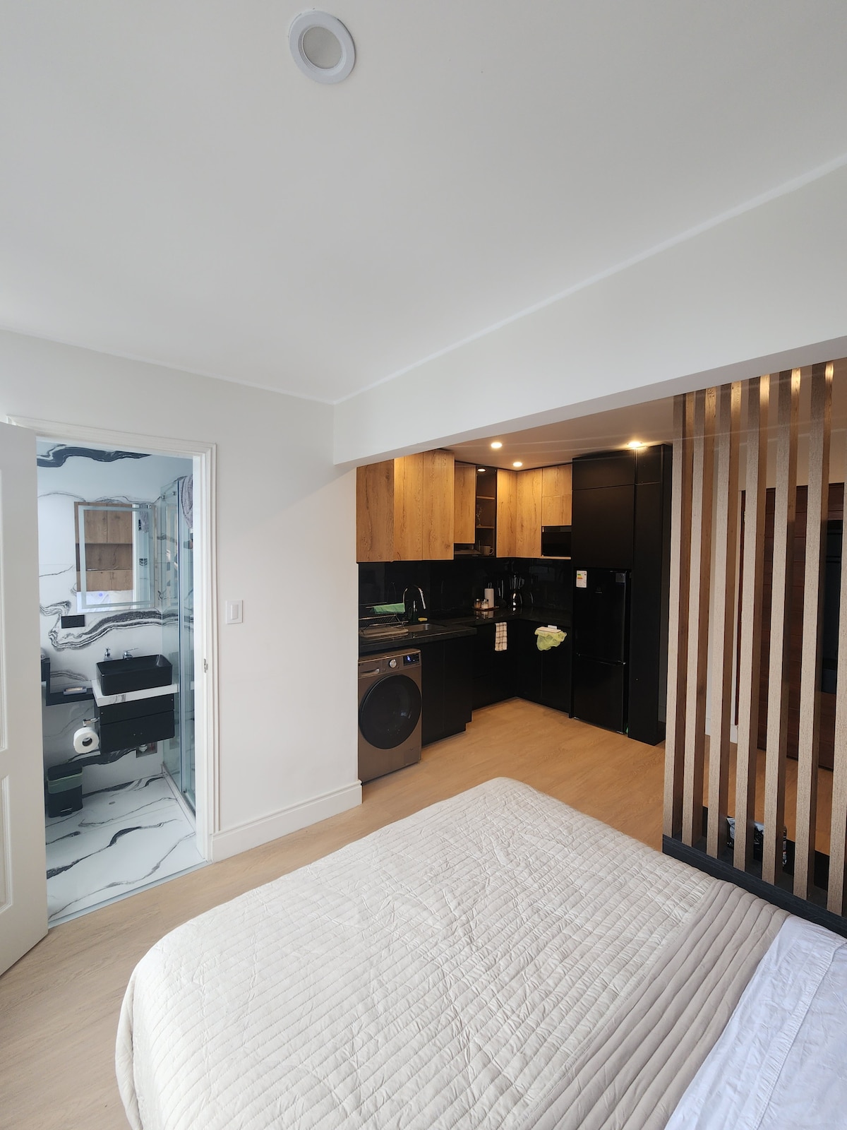 La habitación es totalmente privada y diseñada para viajeros que buscan un alojamiento funcional y sofisticado, con un toque de naturaleza. Está equipado con todo lo necesario para un descanso y baño placenteros, con espacio para trabajar y una bella mesa de madera para comer o tomar algo disfrutando de la amplia vista a la Av. Larco, que está solo a una cuadra de distancia. La ubicación es ideal para que llegues caminando a todos los puntos turísticos. Importante: Las visitas están prohibidas