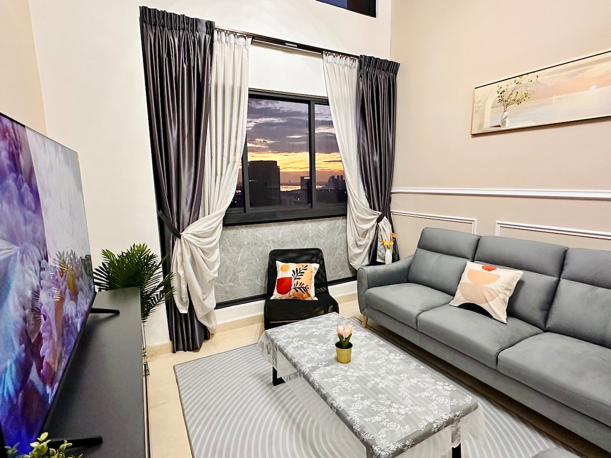 (1+1 BR i 1 bany) Apartament modern i acollidor contemporani al centre de la ciutat de JB. Apte per a 4 persones en família, amics i grups de negocis. ** A 5 minuts de CIQ, City Square, KSL, Pelangi i Larkin. **A 8 minuts de Mid Valley Southkey, Larkin Sentral i Sentosa ** A 15 minuts en cotxe del centre comercial Paradigm, Sutera, Skudai i Mount Austin. Televisor intel·ligent ✔ 4K Wifi ✔ d'alta velocitat, taules de treball amb endoll d'extensió ✔ Rentadora ✔ Aire condicionat a totes les habitacions. Consola ✔ Atari, Mahjong i jocs de taula. ✔ APARCAMENT GRATUÏT per a 1 cotxe
